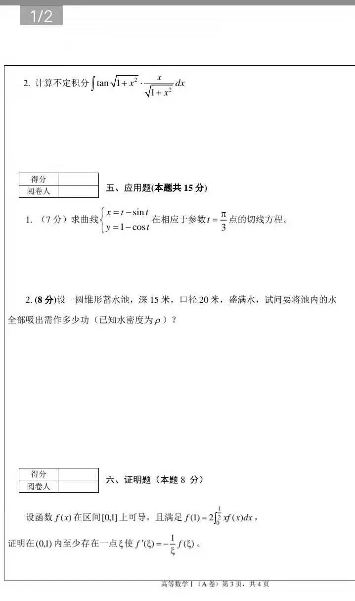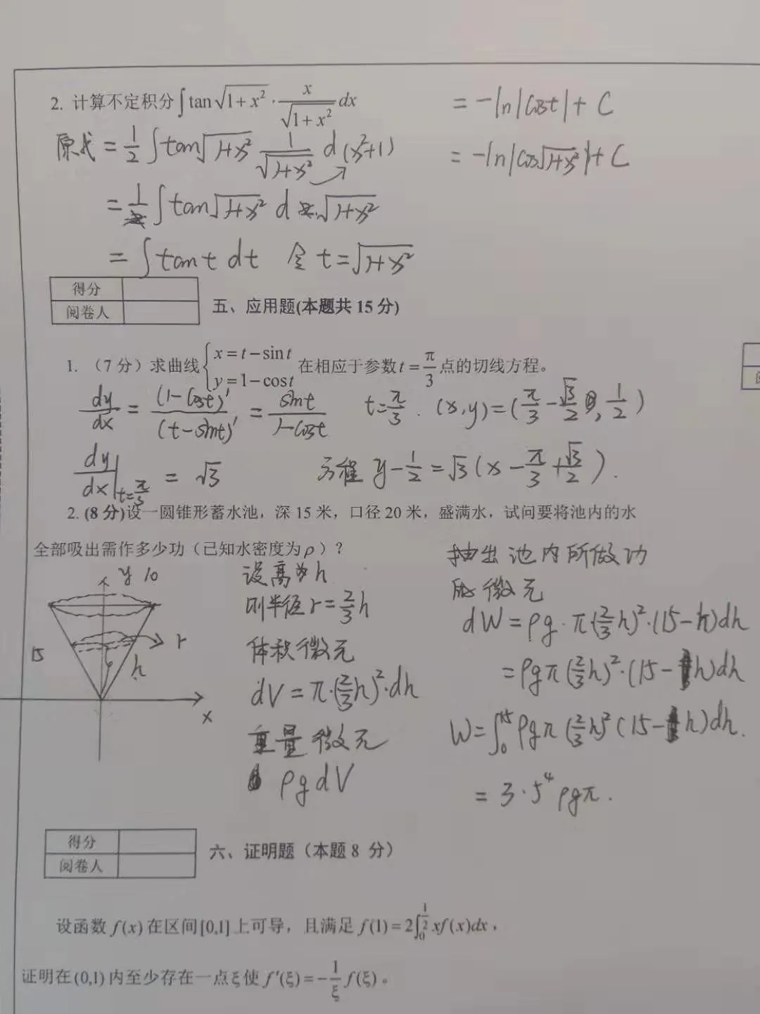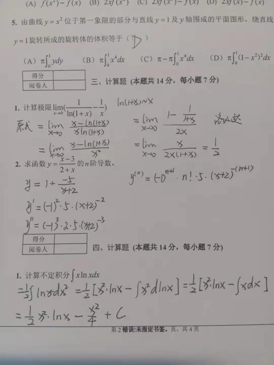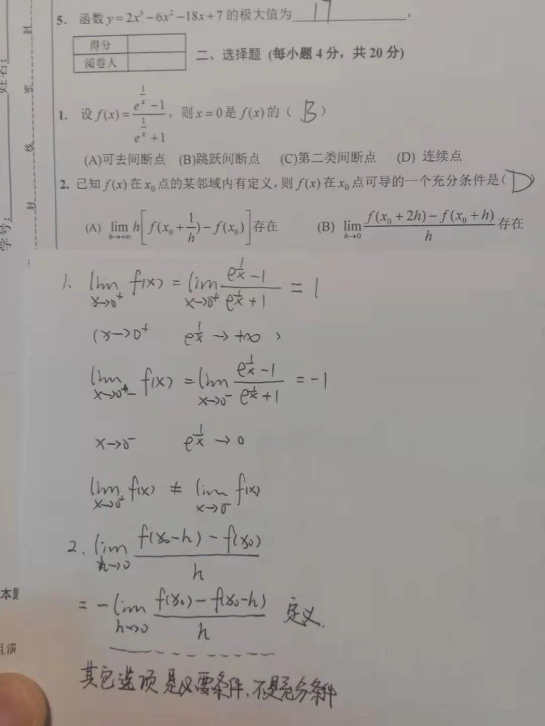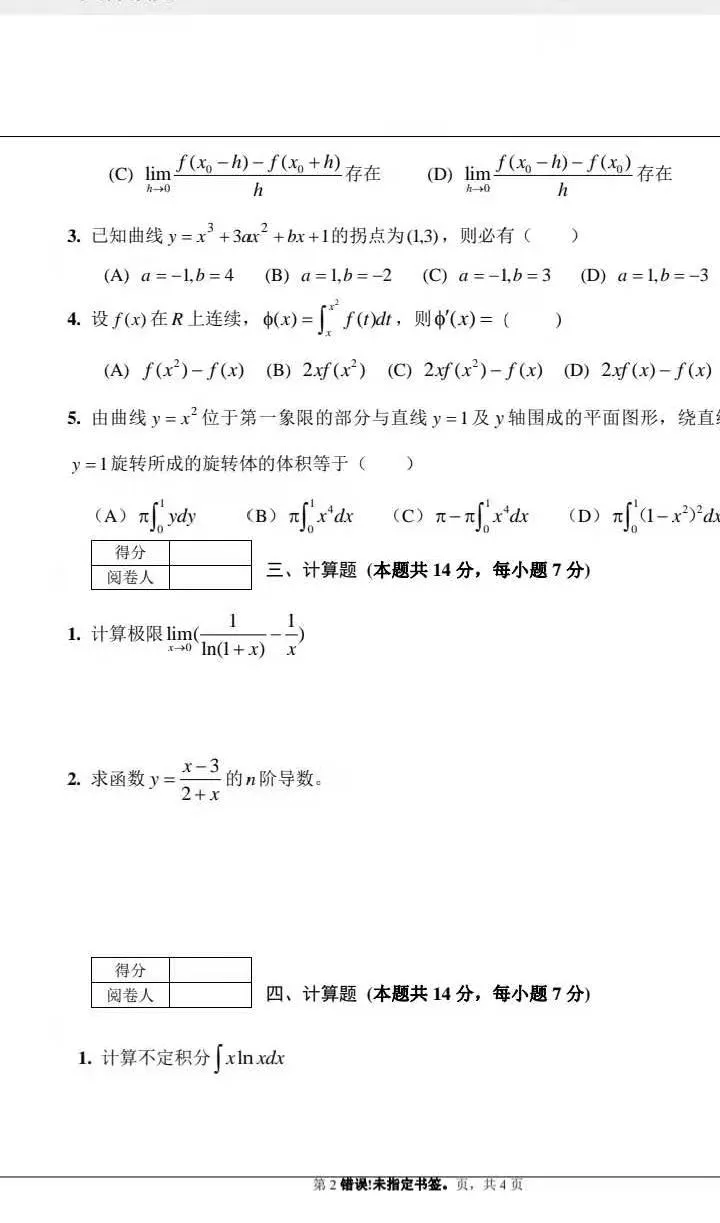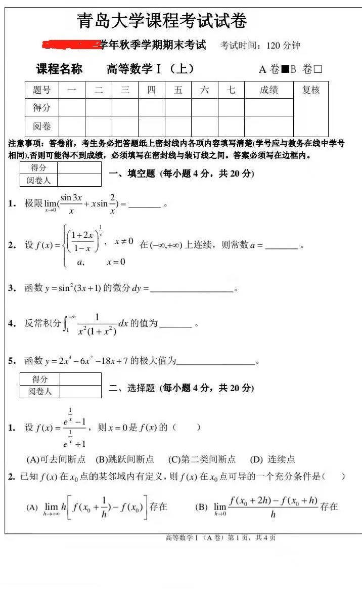 题目来自于微信好友,是青岛大学往年期末真题,高等数学第一学期期末试题,具体哪一年就不说了。