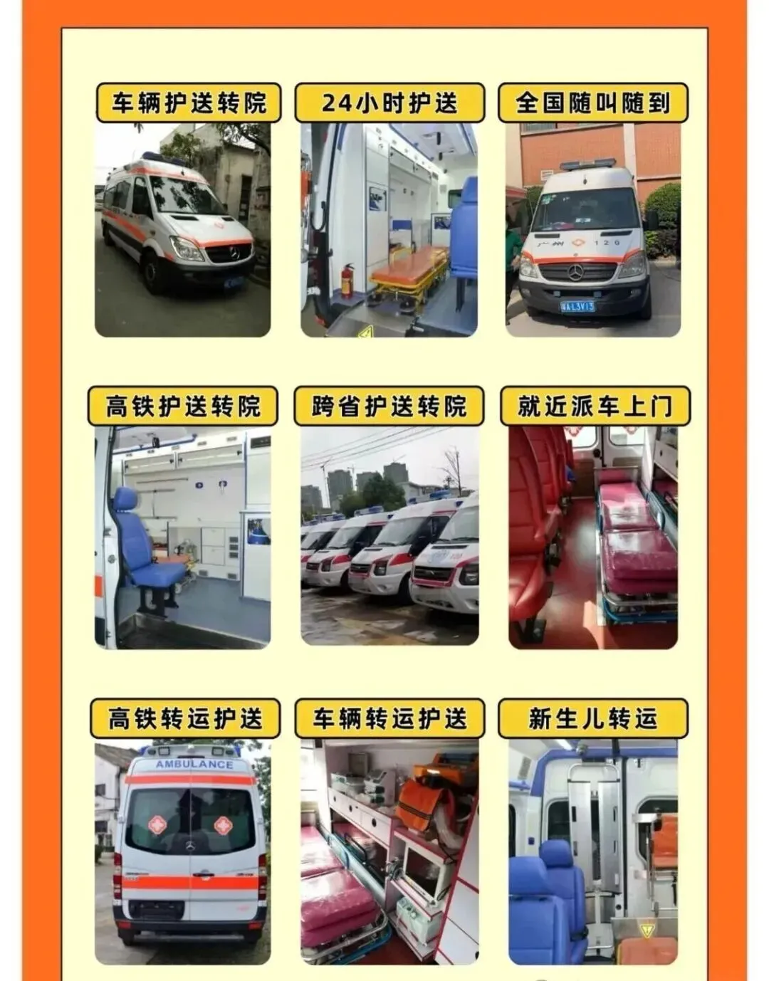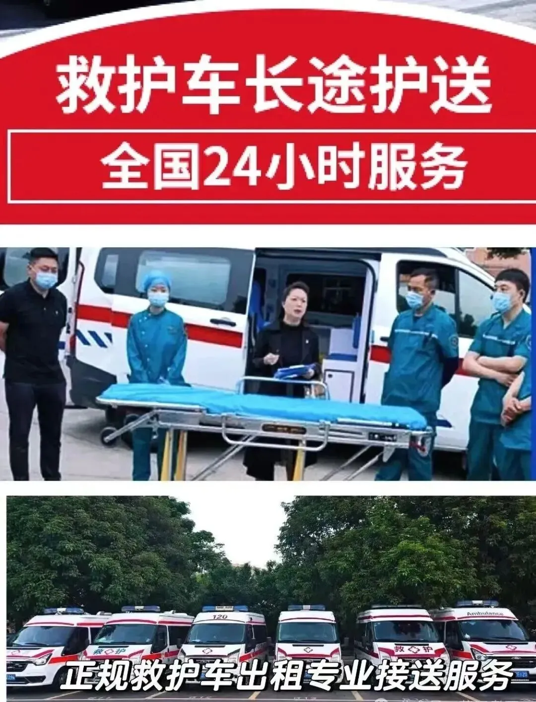 我们是120救护车出租转运服务公司,救护车出租转运,火车接站送站,长途转运,电话遗体转运,这些服务我常我们常年都在做,我们不是急救车。