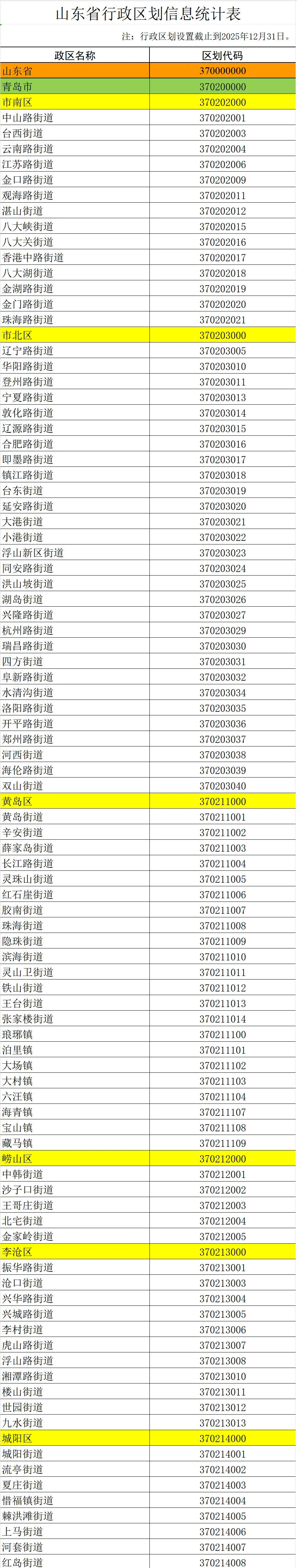 2025年度山东省行政区划信息统计公告