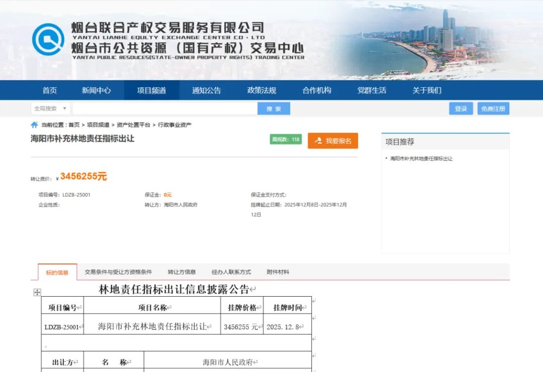 近日,烟台市生态产品交易中心成功完成首宗跨区域补充林地责任指标交易,31.42亩林地责任指标以345.63万元成交,标志着烟台在生态产品价值实现机制上取得突破性进展。