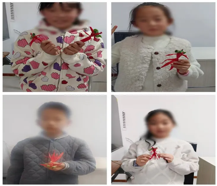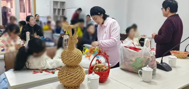 课堂上,同学们和志愿者们热情高涨、专注投入,跟着老师的步骤一步步操作:时而认真倾听讲解,时而互相交流技巧,遇到缠绕不牢固、造型不美观的问题,便主动请教老师、互帮互助。指尖翻飞间,原本平淡无奇的玉米皮渐渐有了形态、有了灵气;欢声笑语中,陌生感渐渐消散,温暖与默契悄然滋生。有人专注于每一个细节,力求作品完美;有人大胆创新,给小金鱼设计独特的造型,每一件作品都承载着大家的用心与热爱。
