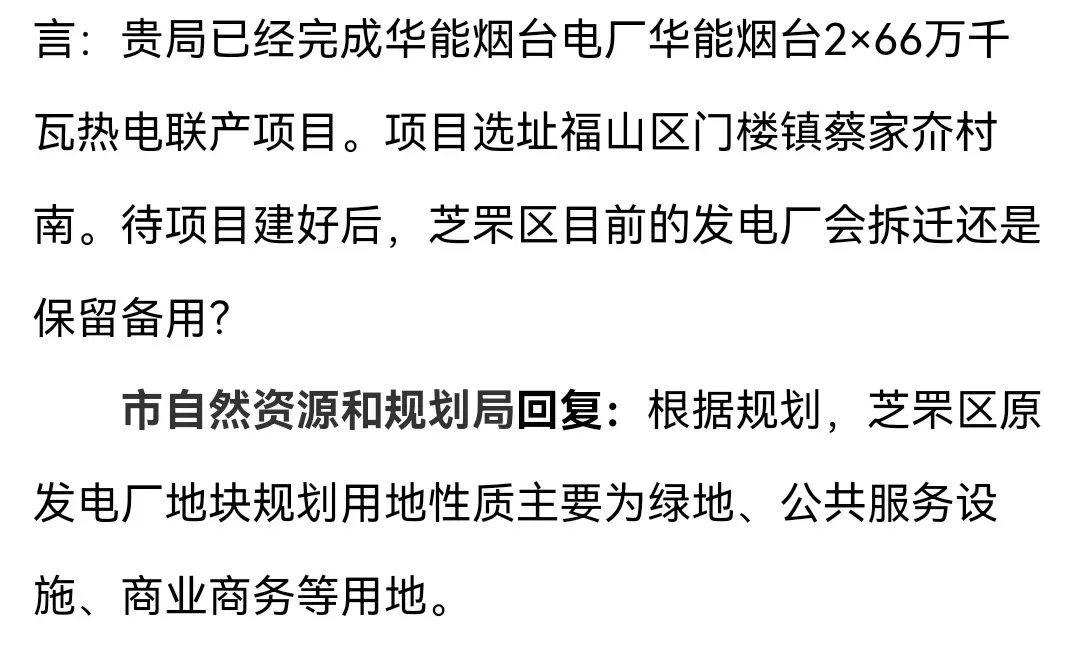 针对“项目建好后,芝罘区目前的发电厂会拆迁还是保留备用”这个问题,烟台市自然资源和规划局回复称,根据规划,芝罘区原发电厂地块规划用地性质主要为绿地、公共服务设施、商业商务等用地。