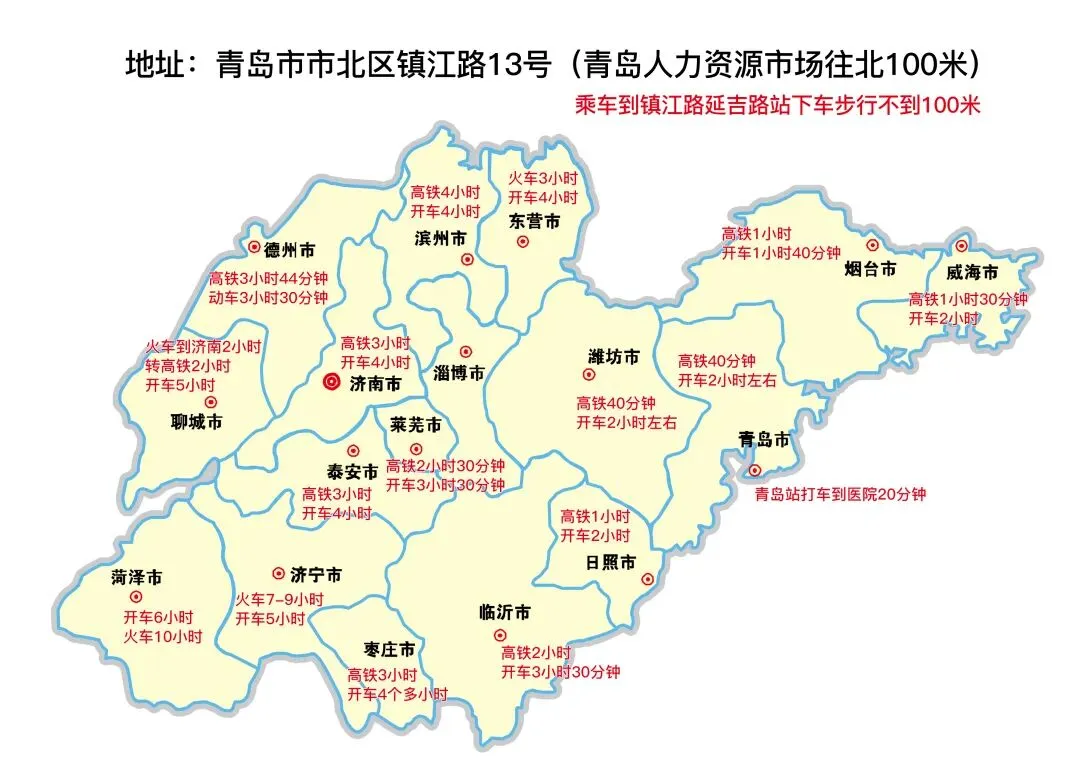 医院坐落于青岛市市北区镇江路13号,高铁交通路网便捷通达,极大减少本地及周边患者的就医奔波。