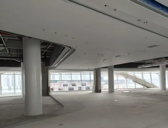 步入建筑内部,通透的屋顶天窗将天光尽数引入,光影流转间,胶州湾的壮阔海景从每一层都能尽收眼底,180度无遮挡的视野让“观海地标”名不虚传。据项目负责人介绍,目前项目已完成地面铺装、电梯安装等基础装修工程,施工团队正集中推进内部商铺的装修作业,严格按照业态规划打磨空间细节,确保商业场景与建筑景观完美融合。