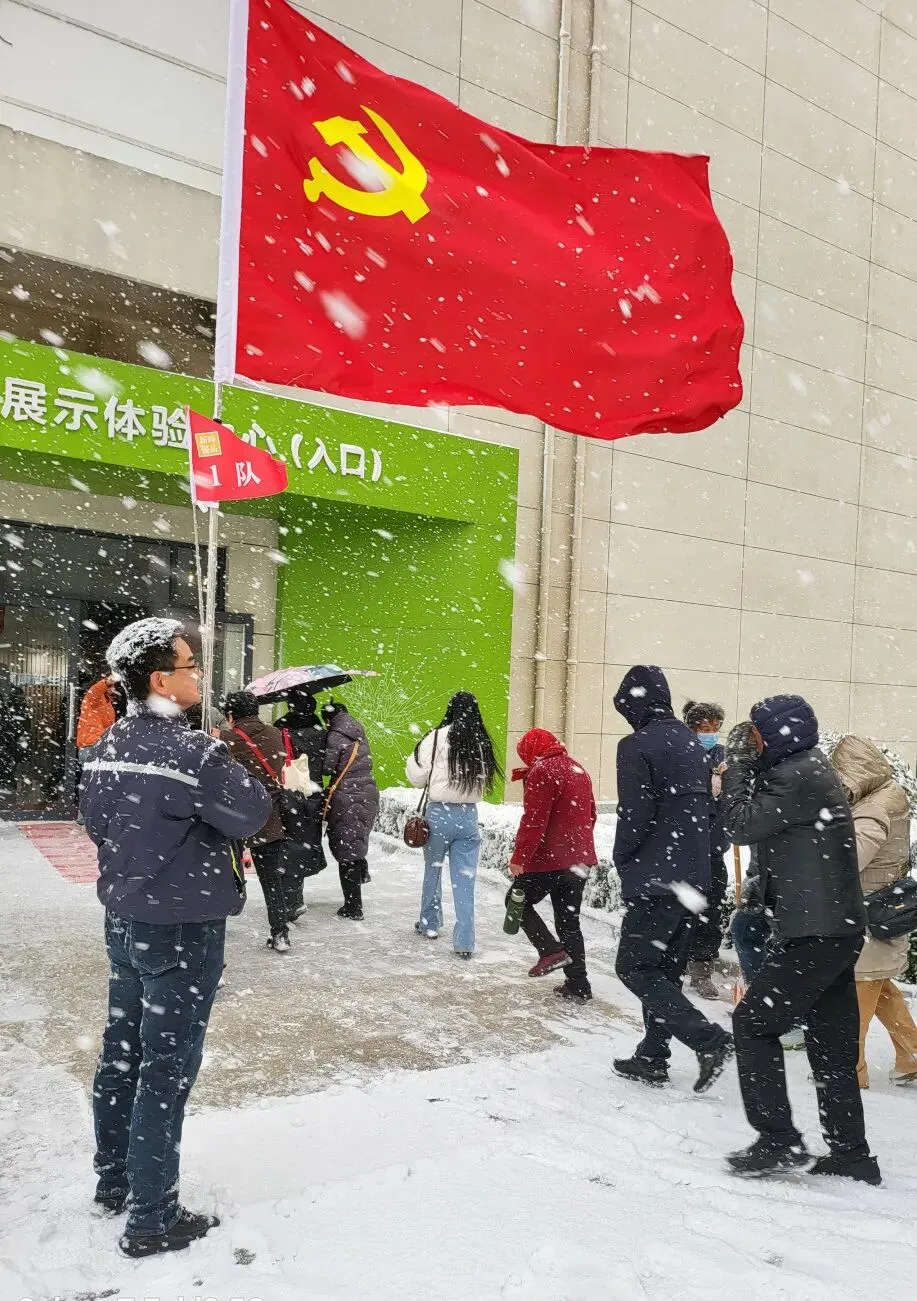 随后,党员同志们高举党旗与队旗,成为雪中最坚定的领航标;队伍末尾,亦有党员贴心守护,为行动不便的家人提供暖心照应,确保无人掉队。