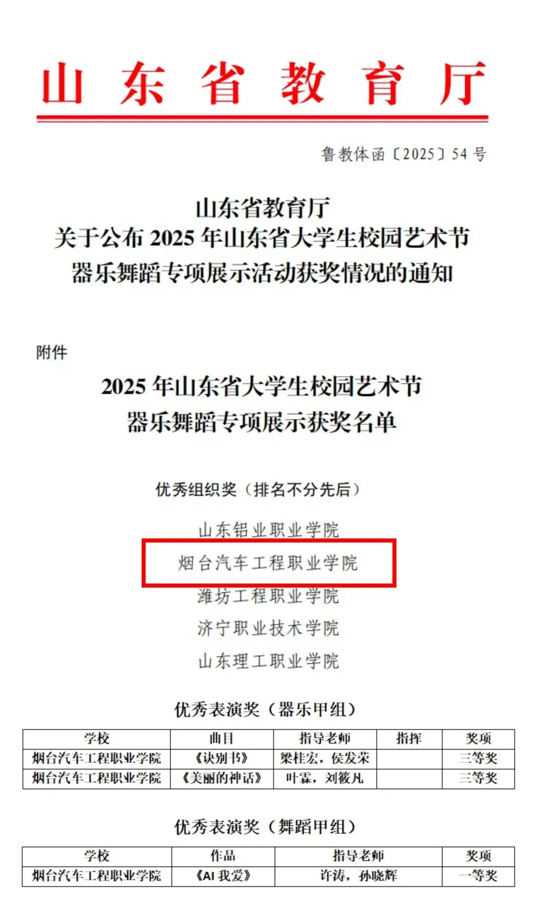 此次载誉而归,不仅是对学院美育教育教学成效的有力印证,更是对师生们刻苦训练的充分肯定。未来,烟台汽车工程职业学院将始终坚守美育育人初心,深化“以赛促教、以赛促学”的育人机制,持续强化学生专业技能与艺术实践能力培养,为培育更多全面发展的高素质应用型人才而奋勇前行。