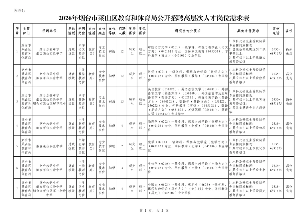本次公开招聘高层次人才的岗位条件、招聘人数等具体要求见《2026年烟台市莱山区教育和体育局公开招聘高层次人才岗位需求表》(附件1)。