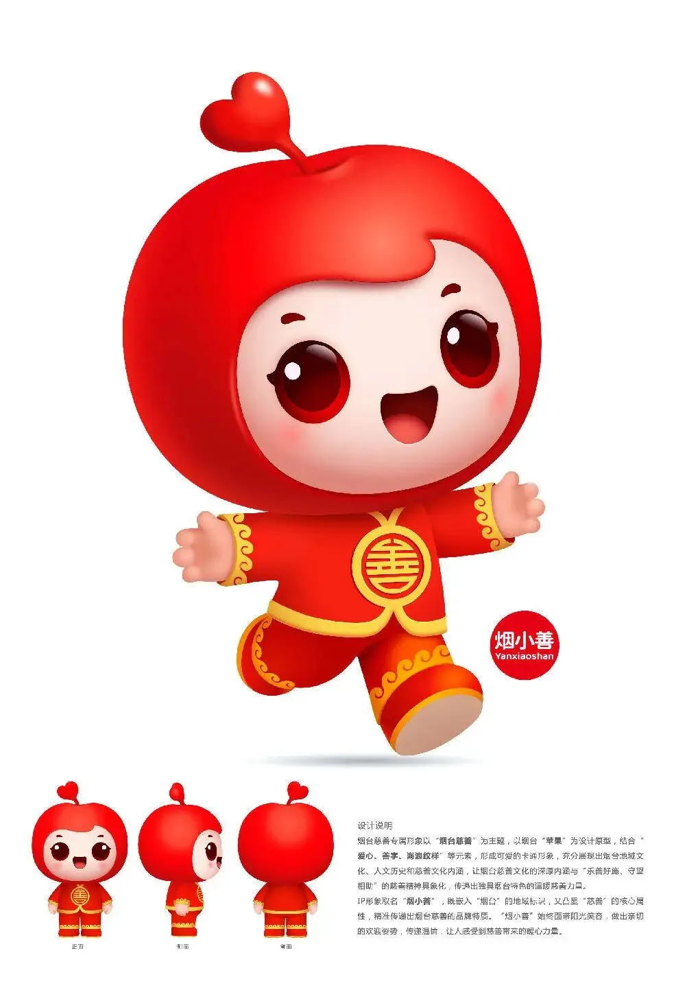 主办方联合专家评审团,秉持公平公正、精益求精的原则,从主题契合度、形象辨识度、应用延展性等多维度综合考量,最终敲定以烟台苹果为设计原型的“烟小善”为烟台慈善专属形象。