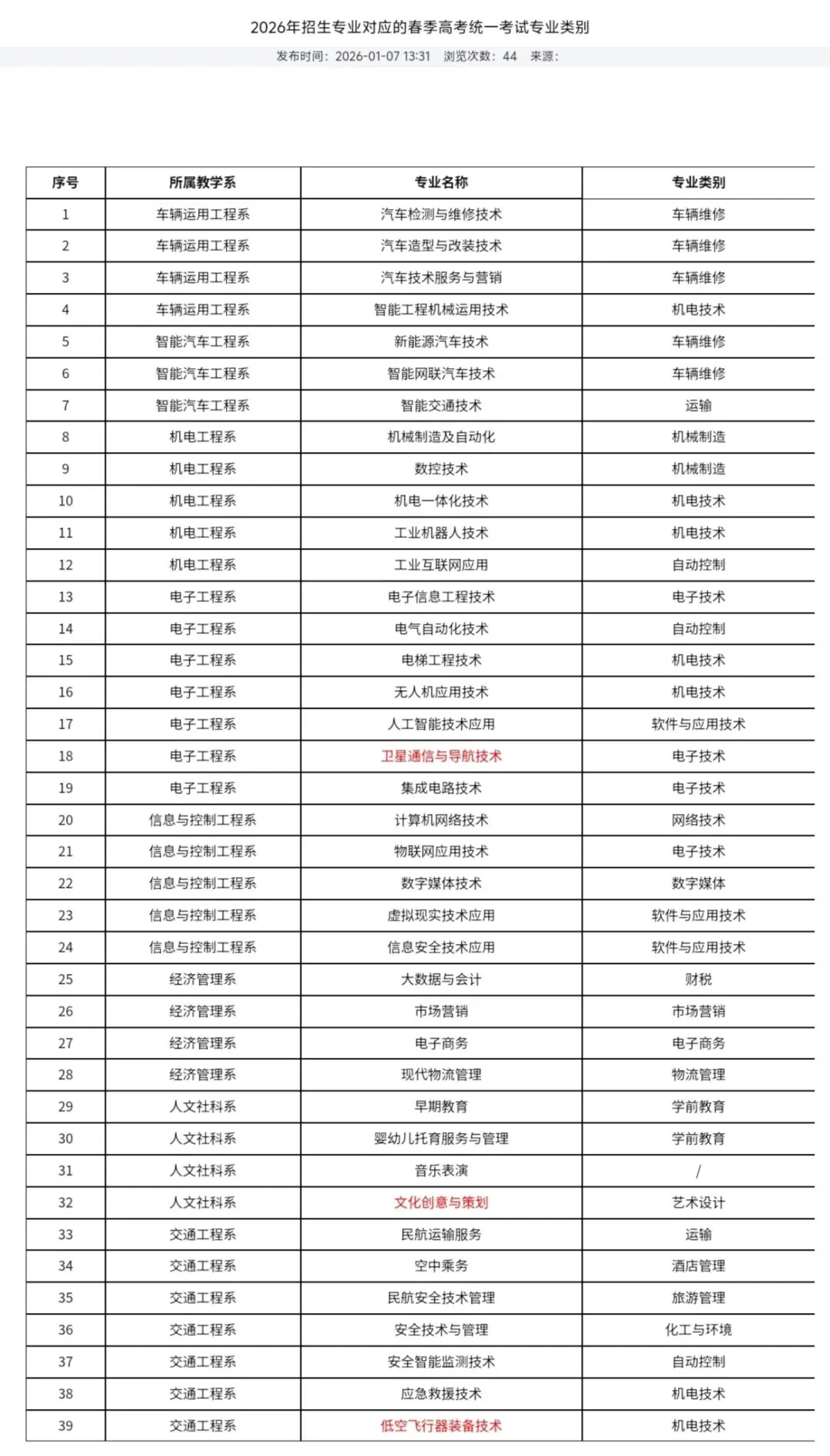 烟台汽车工程职业学院2026年招生专业对应的春季高考统一考试专业类别