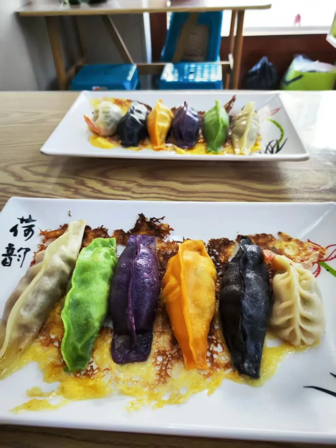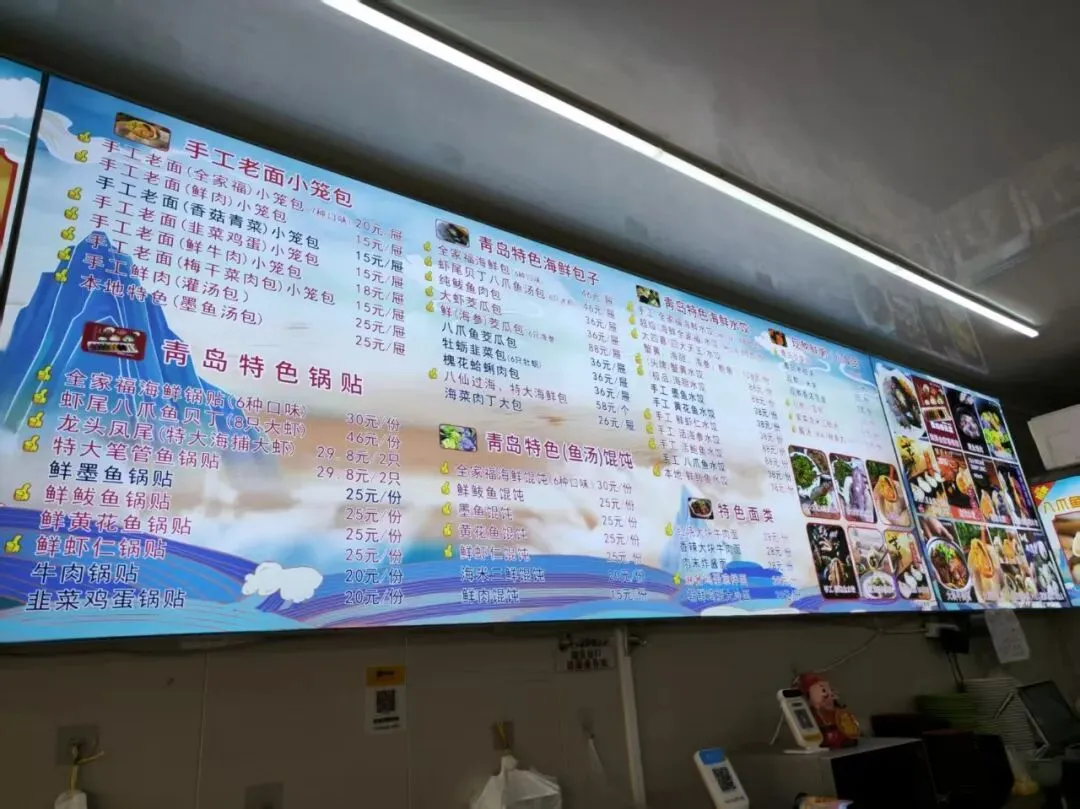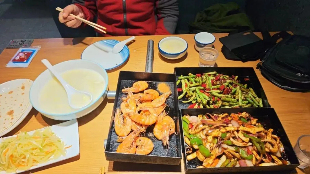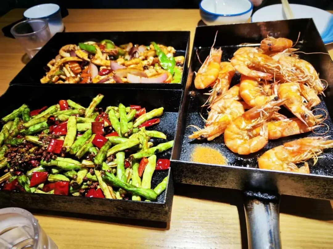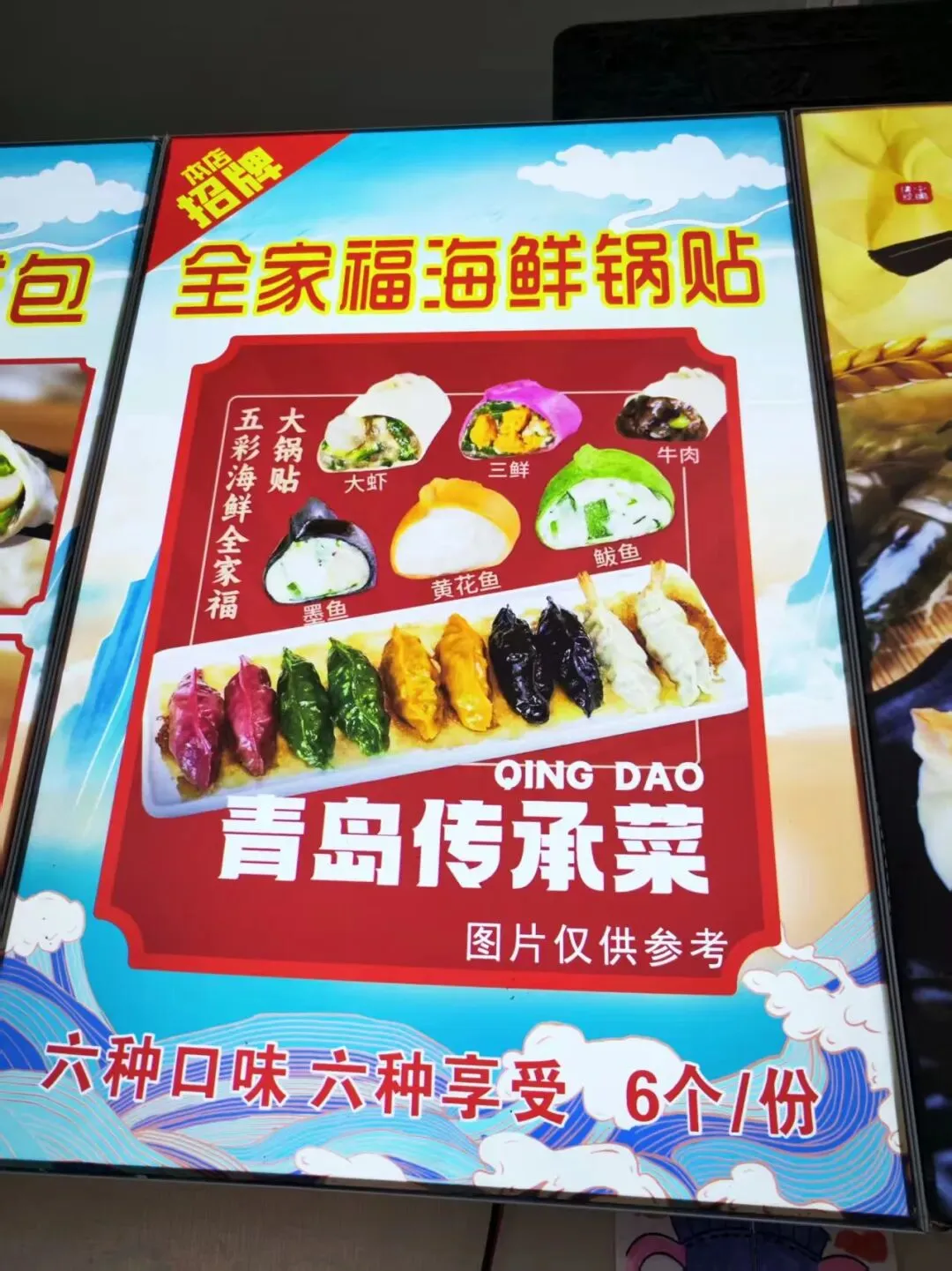 到一个地方都是找当地的特色小吃品尝。到青岛了,在酒店附近的中山路溜达着找特色小吃,看到了这个店。海鲜锅贴。这个店人不多,我们就进去了,写的青岛特色锅贴,肯定是青岛特色了吧。六种颜色分别对应的是大虾,三鲜,牛肉,墨鱼,黄花鱼,鲅鱼馅的锅贴戳子肉。我们过去都没听说过这个吃法呢。算是青岛特色了吧。上套餐,戳子大虾,鱿鱼和干煸芸豆。这个戳子是又当锅又当盘子了。