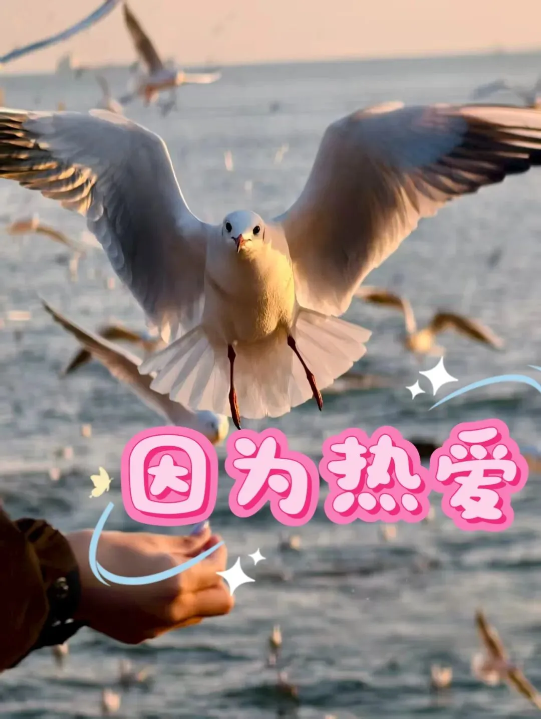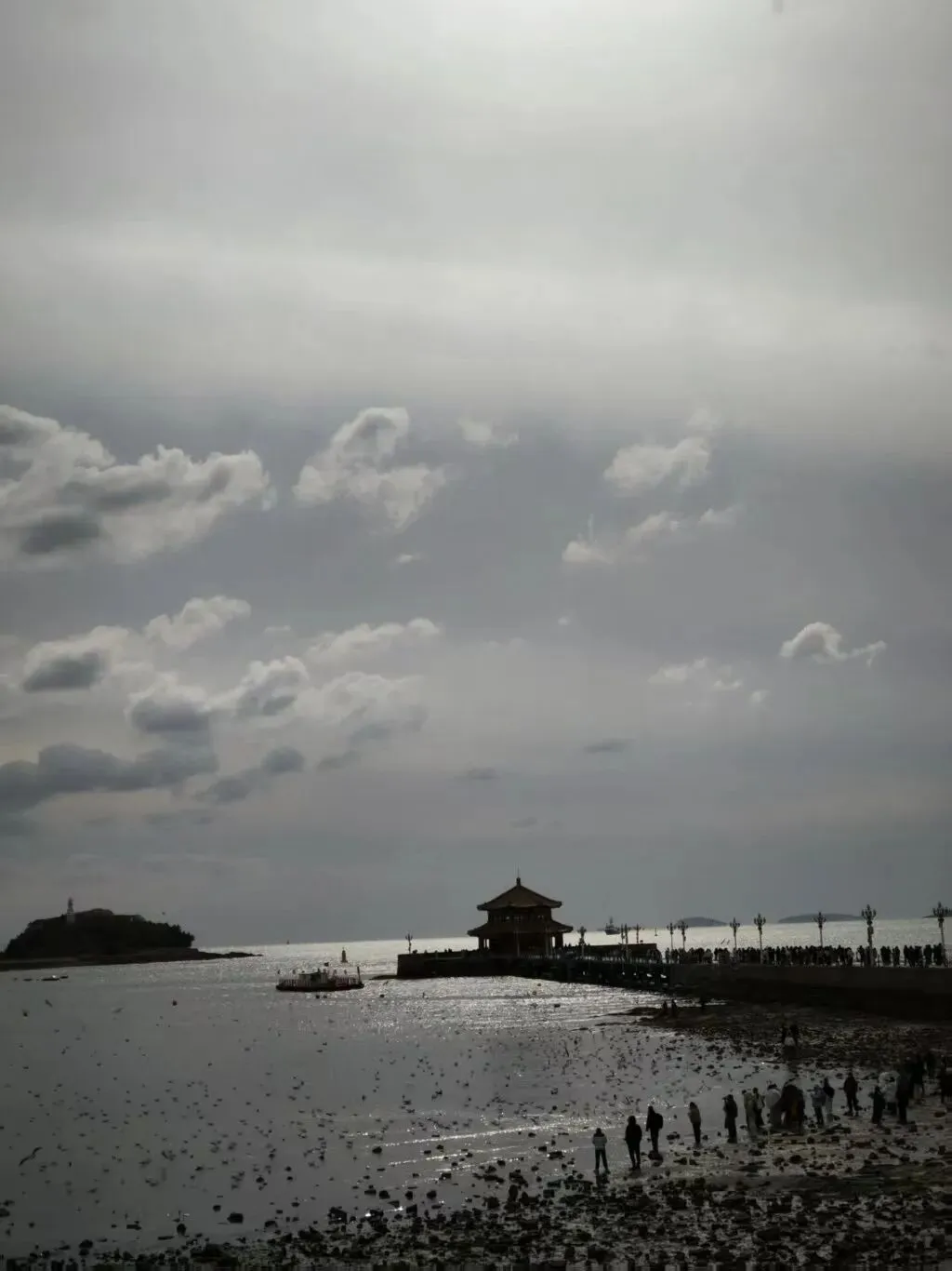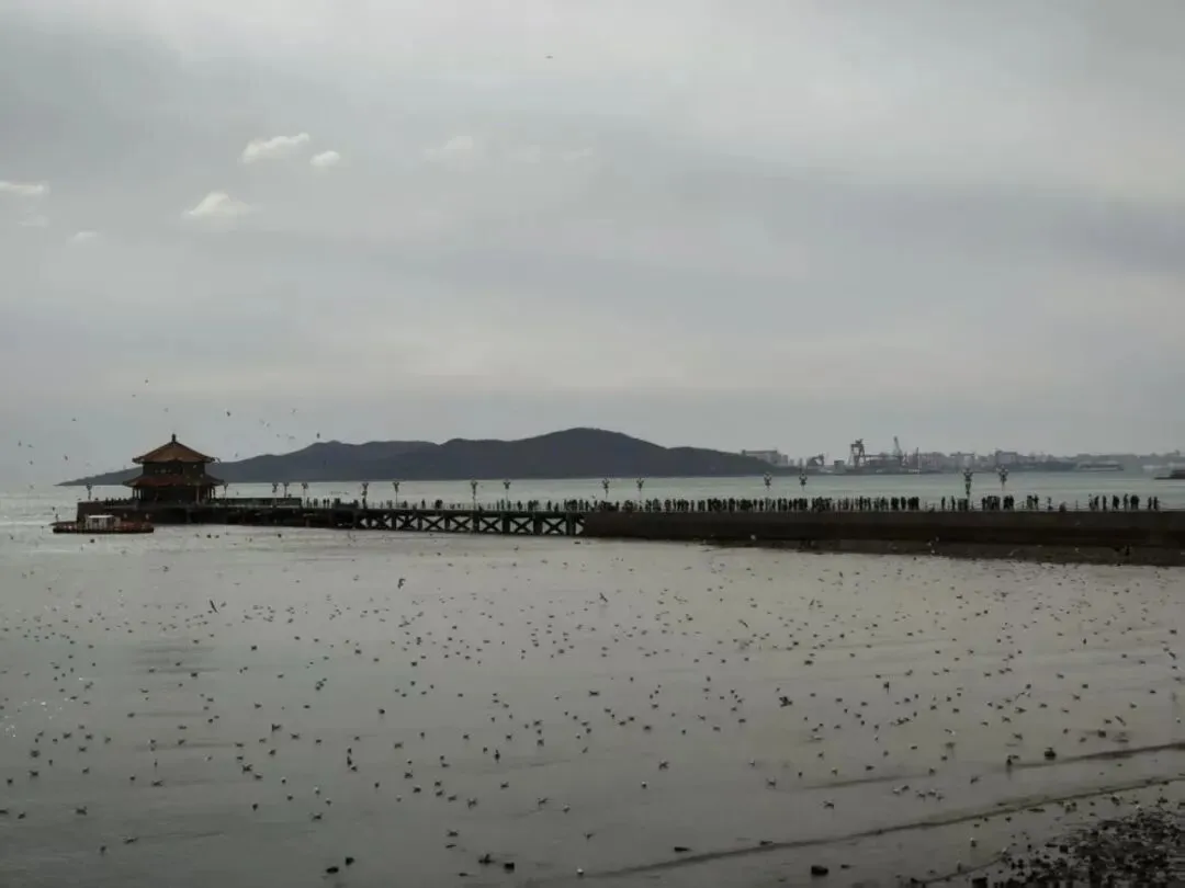 要告别青岛了,再看一眼栈桥,水面上密密麻麻的黑点是海鸥。