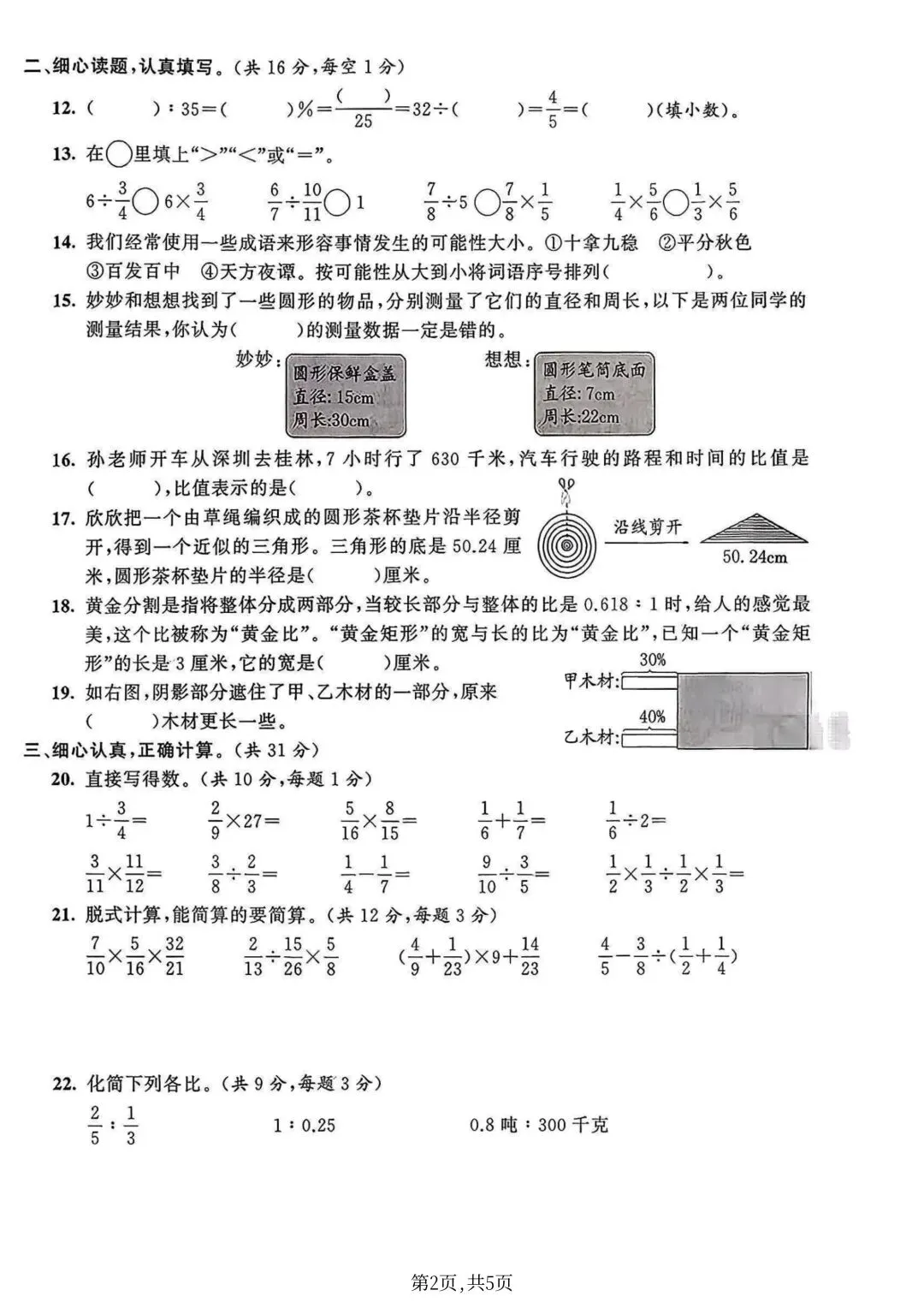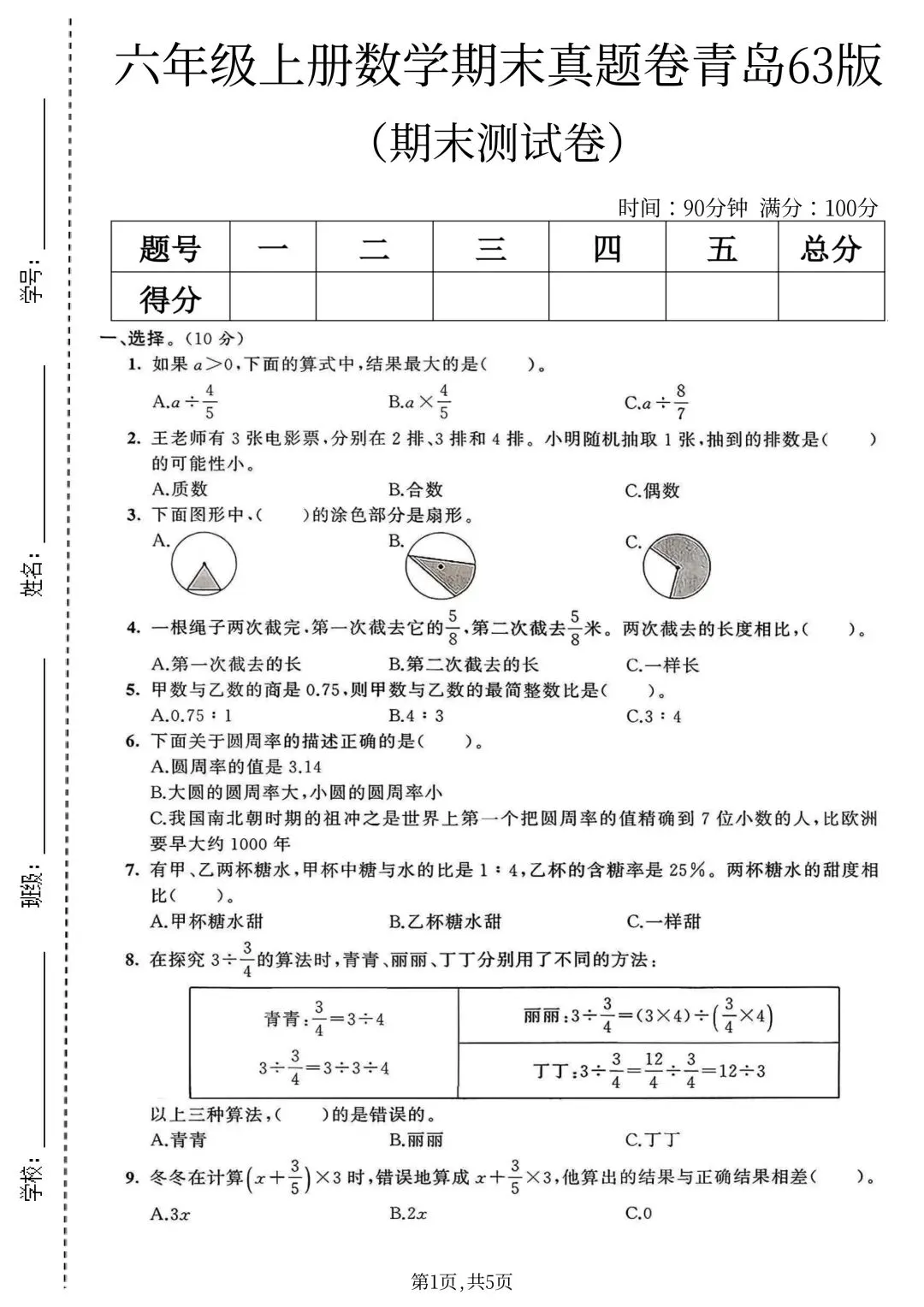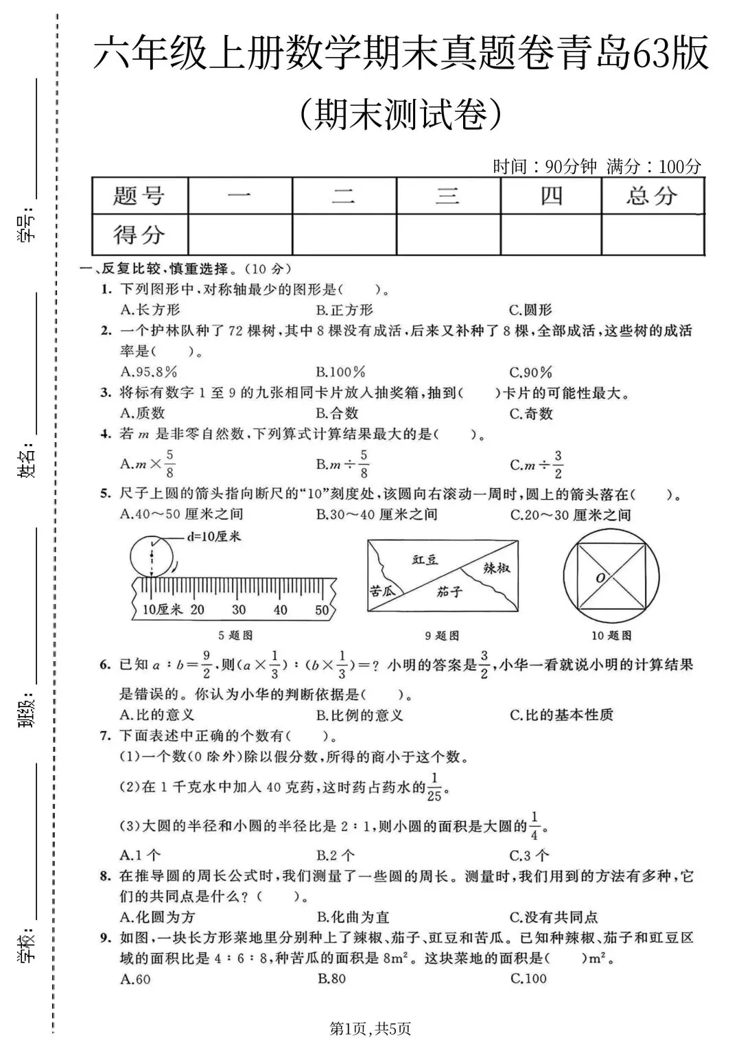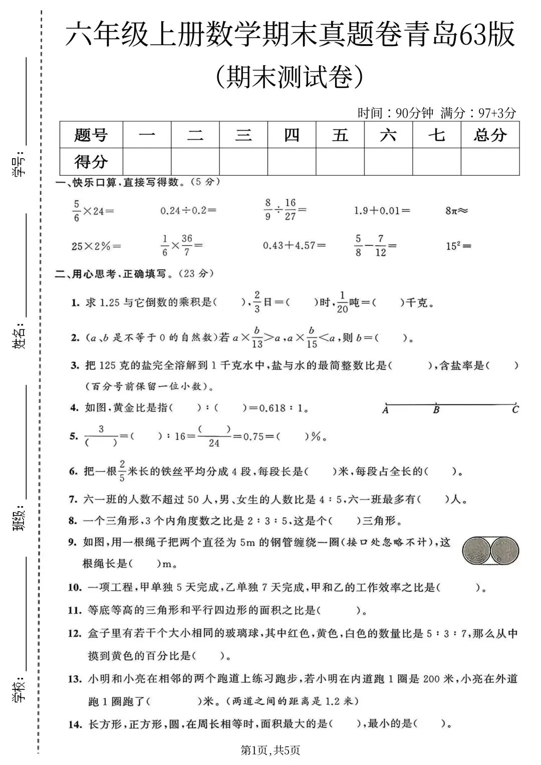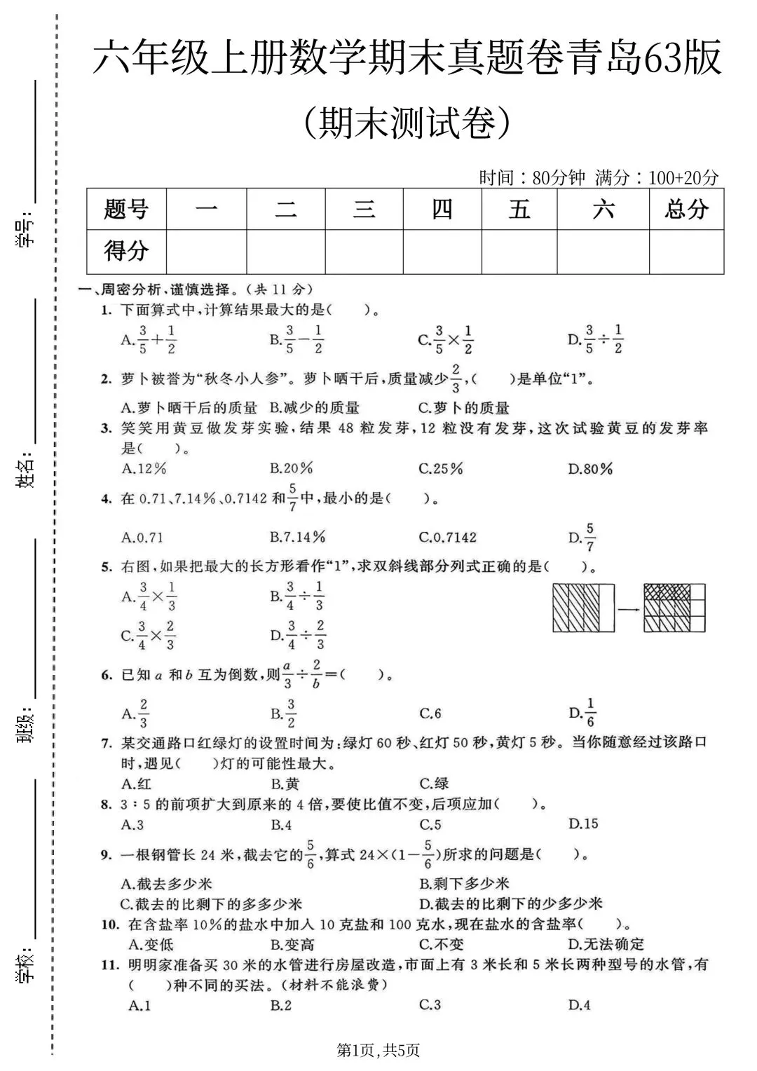 25年六年级上册青岛63版数学(期末复习期末考试卷 期末检测卷 真题卷 共5套 含答案)完整电子版可打印
