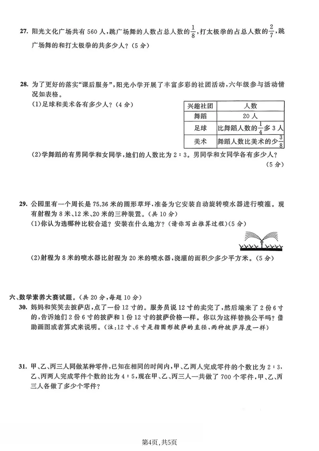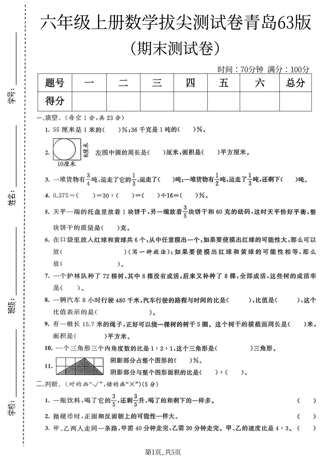>25年六年级上册青岛63版数学(期末复习期末考试卷 期末检测卷 真题卷 共5套 含答案)完整电子版可打印
