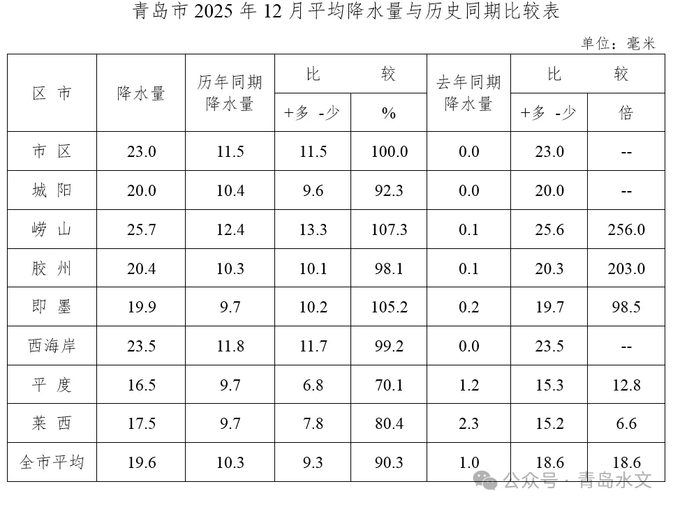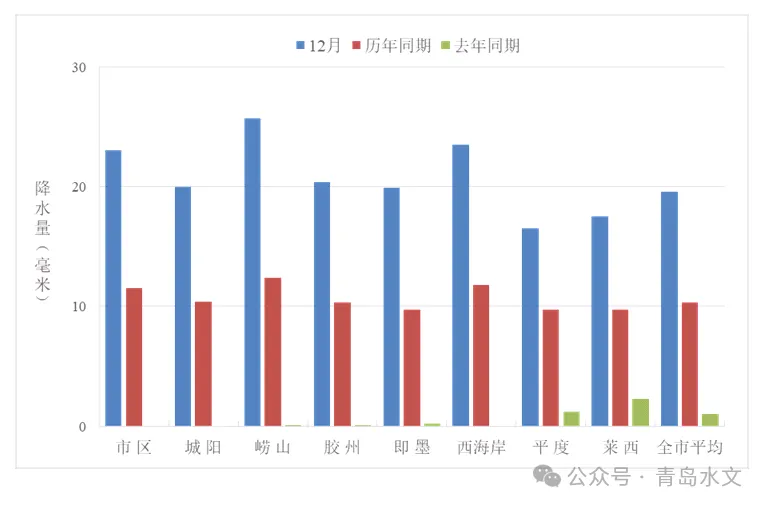 12月份,全市平均降水量19.6毫米,比历年同期偏多9.3毫米(90.3%),比去年同期偏多18.6毫米(18.6倍),列1952年有水文统计资料以来历史同期从大到小第16位,降水偏多。与历年同期相比,各区(市)均偏多,崂山、即墨、市区偏多1倍以上,西海岸、胶州、城阳偏多9成以上,莱西偏多8成以上,平度偏多7成。