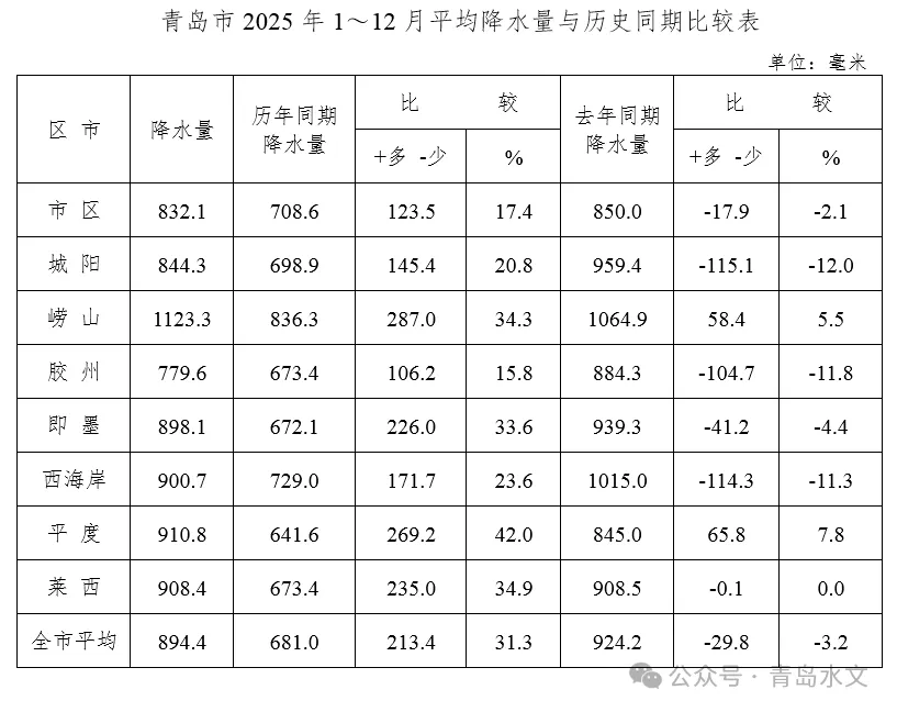 截至12月末,全市平均降水量894.4毫米,比历年同期偏多213.4毫米(31.3%),比去年同期偏少29.8毫米(3.2%),列1952年有水文统计资料以来历史同期从大到小第11位,降水偏多。与历年同期相比,各区(市)均偏多,平度偏多4成以上,莱西、崂山、即墨偏多3成以上,西海岸、城阳偏多2成以上,市区、胶州偏多1成以上。