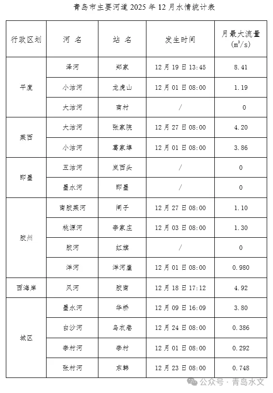 2026年1月1日8时,小沽河葛家埠水文站流量3.72立方米每秒,墨水河华桥水文站流量3.50立方米每秒,泽河郑家水文站流量2.55立方米每秒,大沽河张家院水文站流量2.20立方米每秒,其他主要河道流量较小或处于河干、断流状态。