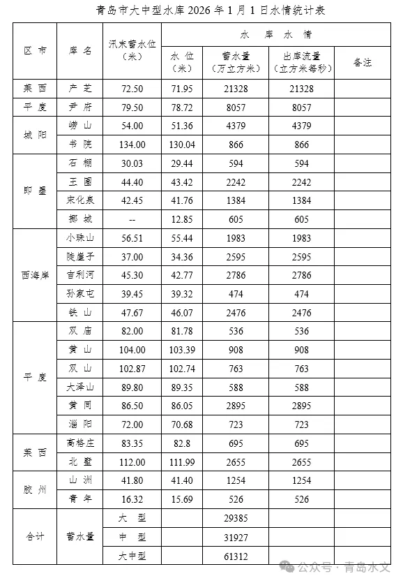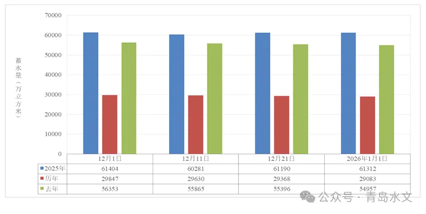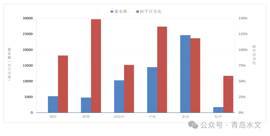12月末,各区(市)大中型水库蓄水量较历年同期均偏多,即墨、平度、莱西、城阳、西海岸、胶州分别偏多148.5%、136.9%、118.4%、91.0%、75.9%和58.6%。