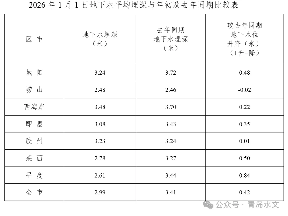 12月末全市地下水平均埋深为2.99米,地下水位较月初上升0.10米,较去年同期上升0.42米。地下水埋深最大点位于平度市蓼兰水利站,为5.84米,较月初上升0.32米。