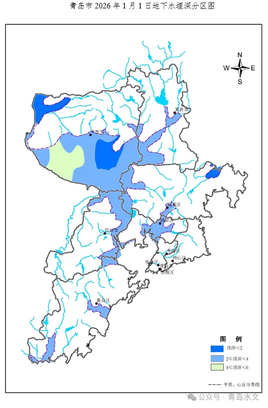 受降水补给影响,12月平度市地下水漏斗区水位回升,各监测站地下水埋深均小于6米,12月末全市地下水漏斗区面积为0,较月初、去年同期均减少150平方千米。