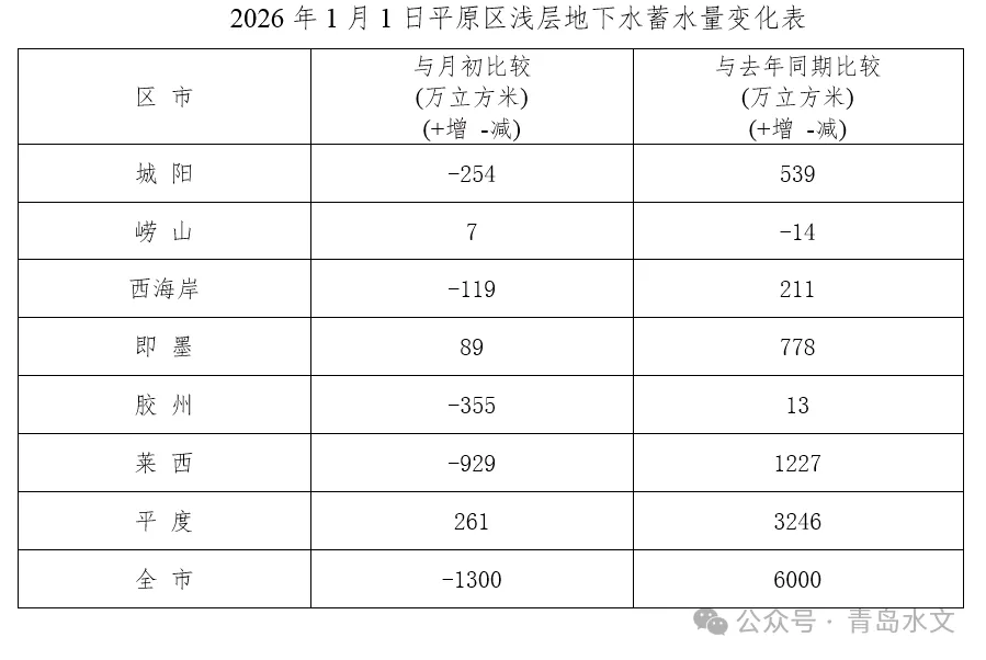 12月末全市平原区浅层地下水蓄水量较月初减小1300万立方米,较去年同期增加6000万立方米。