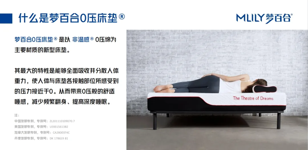 作为0压床垫的开创者,MLILY梦百合是国内先行提出0压概念的品牌,秉持着对创新的热情,以“提升人类的深度睡眠”为使命,10余年来专注于0压绵的研究和测试,并获得四国专利,确保我们创造出的每一个产品都能使用户享受舒服的0压睡眠。