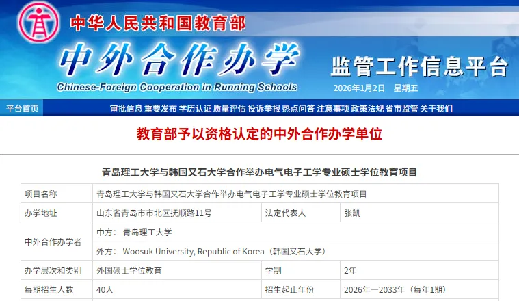 2025年,学校获批首个硕士层次中外合作办学项目。我校与韩国又石大学合作举办的电气电子工学硕士项目,正式通过教育部资格认定并在中外合作办学监管工作信息平台公布。新增实质性合作海外高校15所、研究生海外培养基地1个,获批“汉语桥”团组交流项目、国际青年人才来华交流项目。举办英国高等教育文凭项目高校交流会,连续五年举办“青岛-长滩友城大学生在线笔友项目”等,学校正加速融入全球高等教育“朋友圈”,为培养具有国际视野的高素质人才提供坚实支撑。
