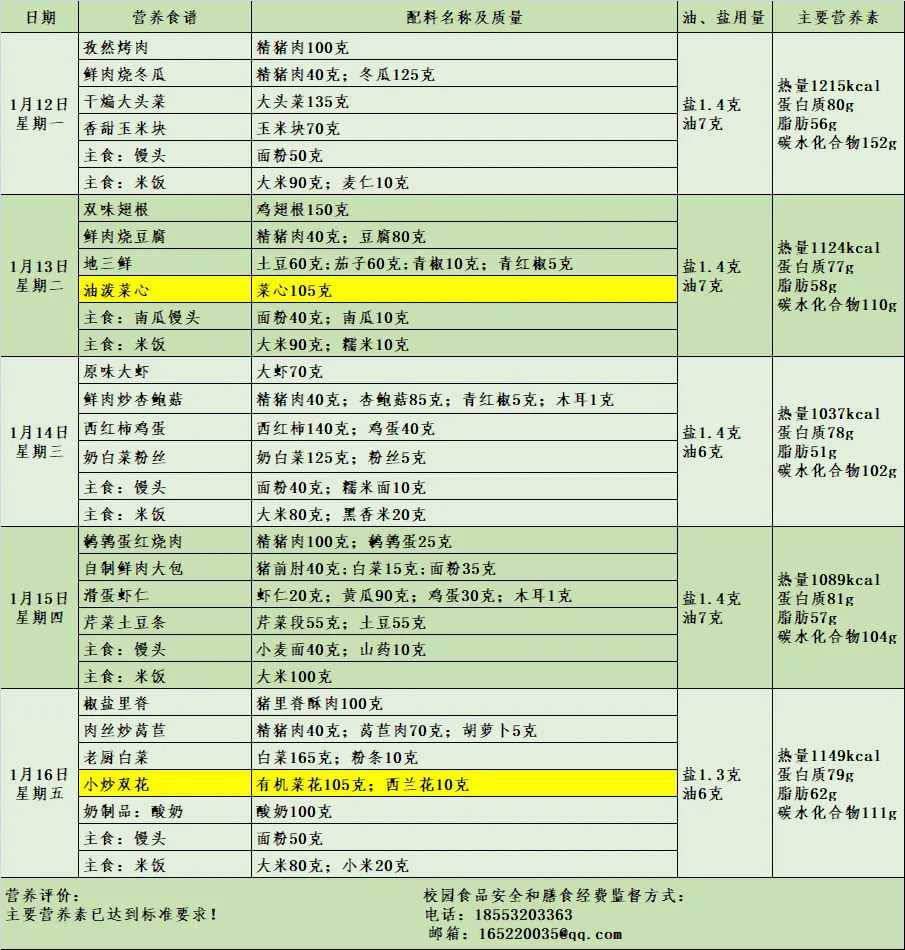 注: 以上菜品会根据原料组织情况或其它不可预见因素可能会做调整,敬请谅解!标注黄色部分为“三减”菜品。祝各位师生用餐愉快!