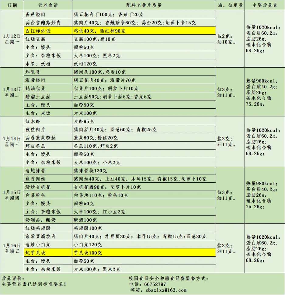 注: 以上菜品会根据原料组织情况或其它不可预见因素可能会做调整,敬请谅解!标注黄色部分为“三减”菜品。祝各位师生用餐愉快!