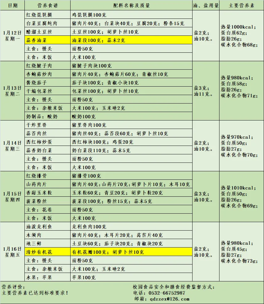青岛上清路小学2025-2026学年度第一学期第二十周学生营养午餐带量食谱(1月12日-1月16日)