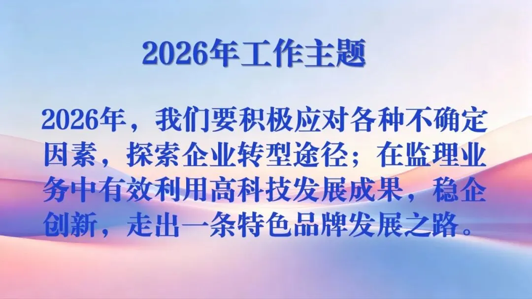 会议一致同意2026年工作主题为:2026年,我们要积极应对各种不确定因素,探索企业转型途径;在监理业务中有效利用高科技发展成果,稳企创新,走出一条特色品牌发展之路。