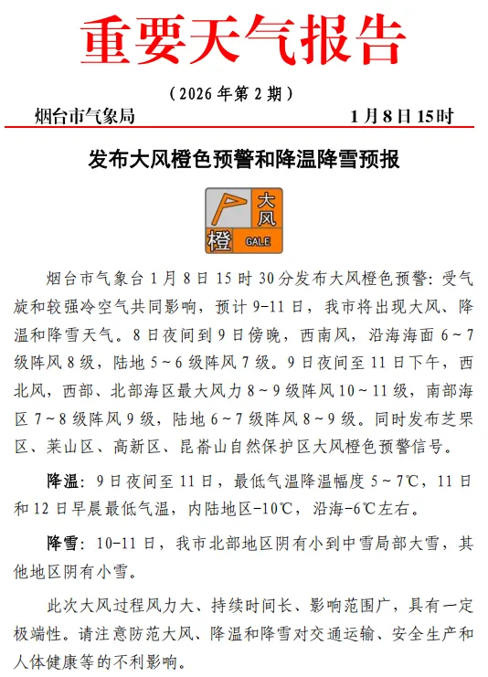 受气旋和较强冷空气共同影响,预计9-11日,我市将出现大风、降温和降雪天气。8日夜间到9日傍晚,西南风,沿海海面6~7级阵风8级,陆地5~6级阵风7级。9日夜间至11日下午,西北风,西部、北部海区最大风力8~9级阵风10~11级,南部海区7~8级阵风9级,陆地6~7级阵风8~9级。同时发布芝罘区、莱山区、高新区、昆嵛山自然保护区大风橙色预警信号。