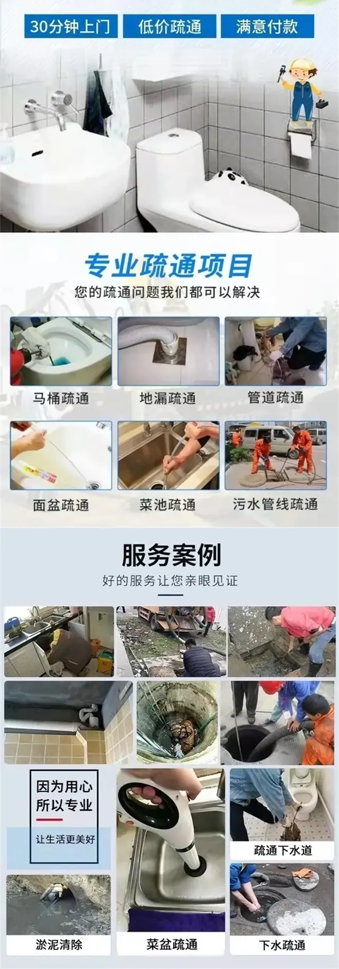 高压清洗油垢、泥沙、头发、皂垢,减少反复堵塞问题