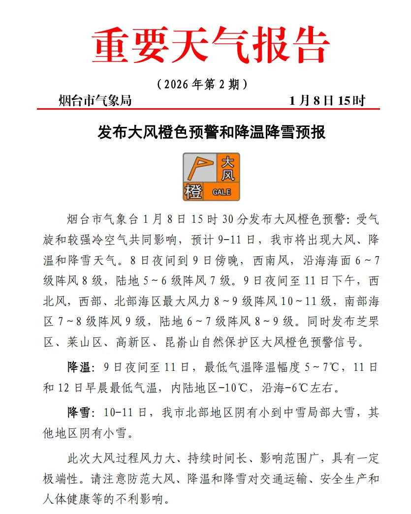 受气旋和较强冷空气共同影响,预计9-11日,我市将出现大风、降温和降雪天气。8日夜间到9日傍晚,西南风,沿海海面6~7级阵风8级,陆地5~6级阵风7级。9日夜间至11日下午,西北风,西部、北部海区最大风力8~9级阵风10~11级,南部海区7~8级阵风9级,陆地6~7级阵风8~9级。同时发布芝罘区、莱山区、高新区、昆嵛山自然保护区大风橙色预警信号。