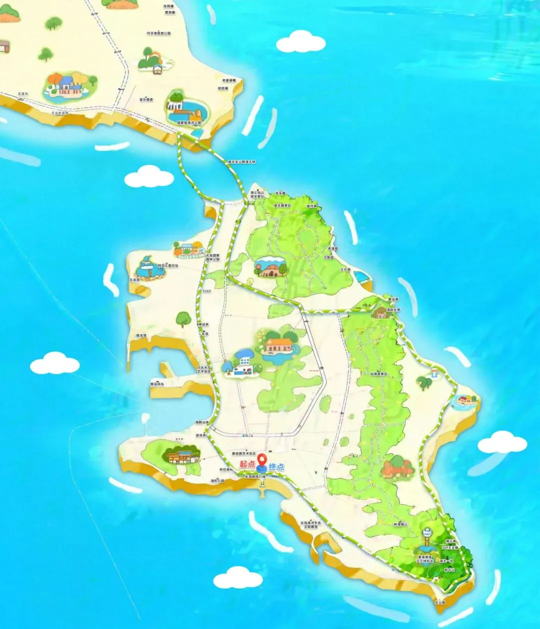 ★明珠广场(起点)→文化街→通海路→海滨路→玉石街→南北连岛大桥→长山路→长岛第二实验中学→王沟→仙境源景区慢行路→孙家→老虎洞→林海景区→海边慢行路→明珠广场(终点)
