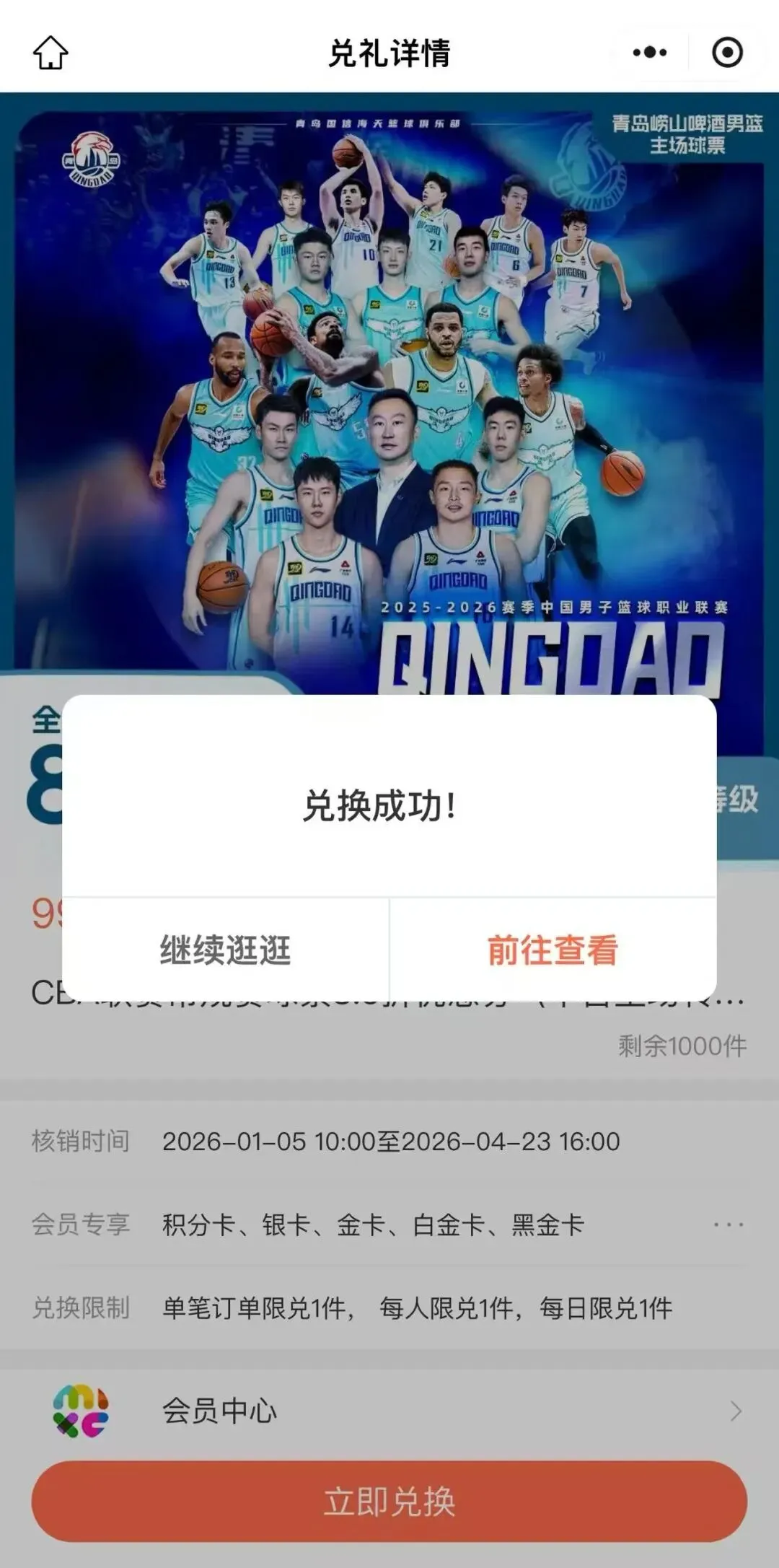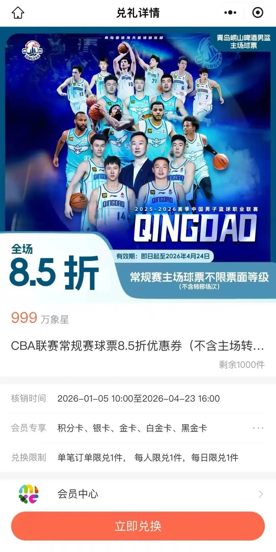 青岛国信海天篮球俱乐部×万象城宠粉福利上线!万象城会员专享福利:仅需999万象星,即可兑换本赛季CBA常规赛青岛主场球票8.5折优惠券!