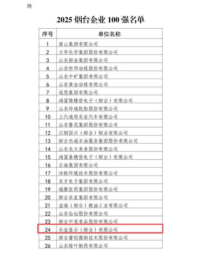2025年10月,在烟台市企业联合会发布的“2025烟台企业100强名单”上,乐金显示(烟台)有限公司位居第24位。