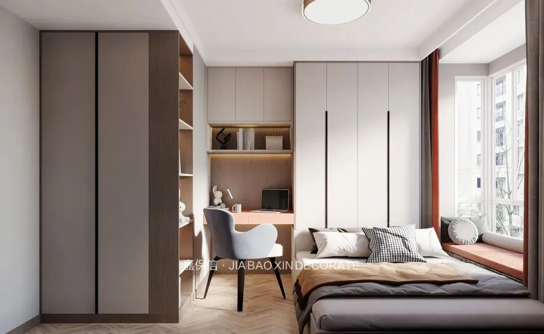 主卧以木地板搭配低矮造型的床品,打造舒适的休憩空间。通顶衣柜和悬空书桌各司其职,功能清晰。飘窗铺上软垫,便成了随性又惬意的休闲角落。