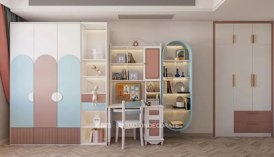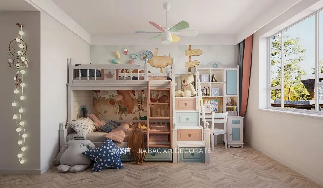 儿童房布置了一座可攀爬的双层床,既配有楼梯,也保留了爬梯,让孩子在安全的前提下尽情探索。书桌自带储物,与壁龛式置物架、半开放式储物柜及通顶衣柜巧妙结合,将空间利用得细腻而周全。浅色调的搭配映衬着木地板,清新又治愈。