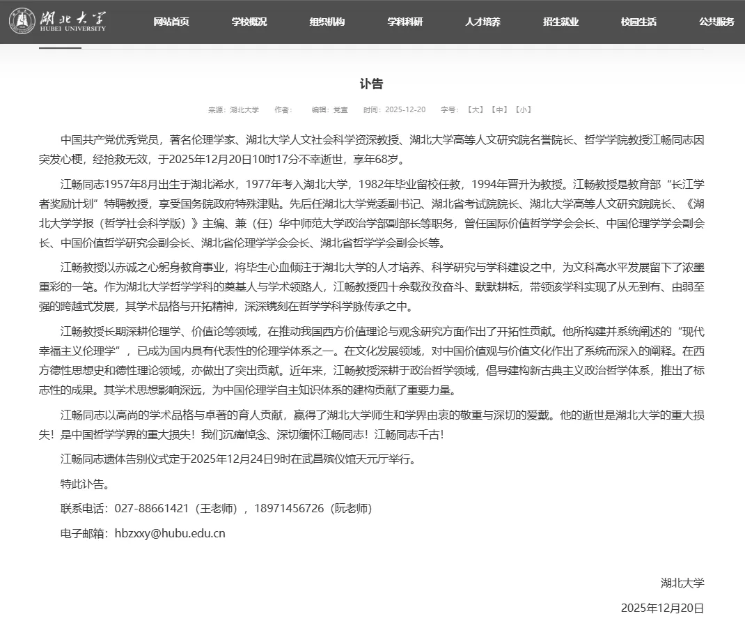 湖北大学于2025年12月20日发布讣告:中国共产党优秀党员,著名伦理学家、湖北大学人文社会科学资深教授、湖北大学高等人文研究院名誉院长、哲学学院教授江畅同志因突发心梗,经抢救无效,于2025年12月20日10时17分不幸逝世,享年68岁。