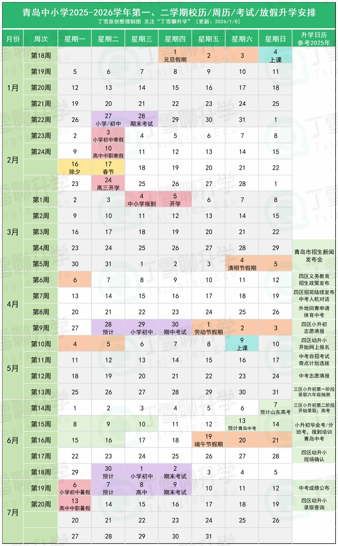 丁雪根据当前发布的校历制作了2026年上半年的日历,包含了校历、周历、考试、放假和升学相关的内容。升学部分参考的是2025年的时间,后面也会做详细的分享,这里就是大体上写了一下~目前青岛大部分区市的期末时间已定,小学基本集中在1月27日期末考试,初中基本集中在1月27日和28日期末考试。考完后基本就放假了,咱们可以提前把假期规划安排起来啦!第一学期放假时间比较晚,所以开学后的下学期时间也变得更紧张一些。按照青岛市教育局公布2025-2026学年第二学期的校历,小雪个人推断了一下,青岛小学和初中期中预计在4月底进行期中考试,预计在7月初进行期末考试。青岛中小学2025-2026学年第二学期在校时间有20周,其中第20周高中中职放假,第19周小学和初中放假。所以我们实际在校的时间分别为19周和18周。小学和初中去掉期末考试周,实际上课时间为17周,去掉清明节、五一和端午假期,实际上课时间为16周,这还算上了周六日。小升初、中考以及要参加地生会考的学生和家长们更要特别注意了哦~预祝大家期末考个好成绩!也期待大家的寒假计划,加油!
