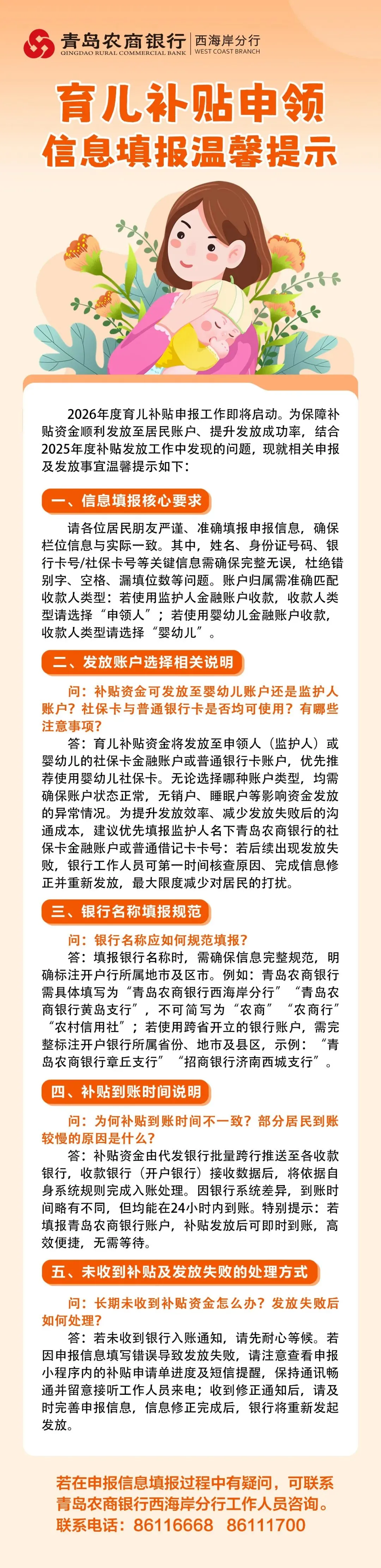 >青岛农商银行西海岸分行育儿补贴申领信息填报温馨提示