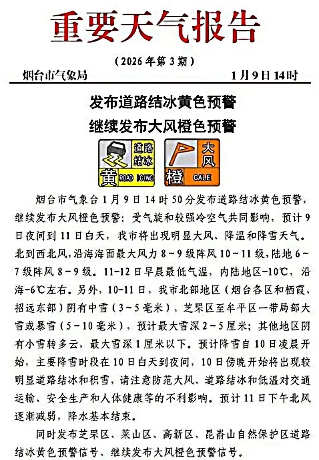 烟台市气象局已发布道路结冰黄色预警及大风橙色预警,预计今日(1月9日)夜间至11日白天将出现大风、降温、降雪及道路结冰现象。为切实保障您的人身安全,依据公园安全管理规定,烟台磁山地质公园自2026年1月10日起实施封山措施,全面暂停入园游览活动。