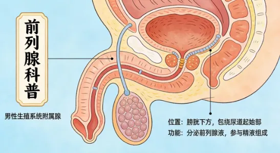 前列腺是男性生殖系统中的一个重要器官,大小和形状都像一颗栗子,它位于膀胱正下方,环绕着尿道。前列腺体积不大,但它的作用非常重要: