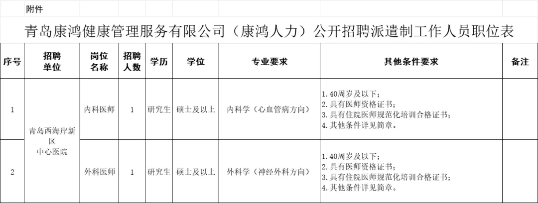 附件1:青岛康鸿健康管理服务有限公司(康鸿人力)公开招聘派遣制工作人员职位表