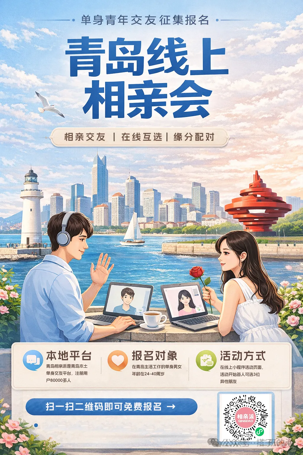 限青岛本地或在青岛工作生活的单身人士,有稳定收入、正确婚恋观的单身男女。