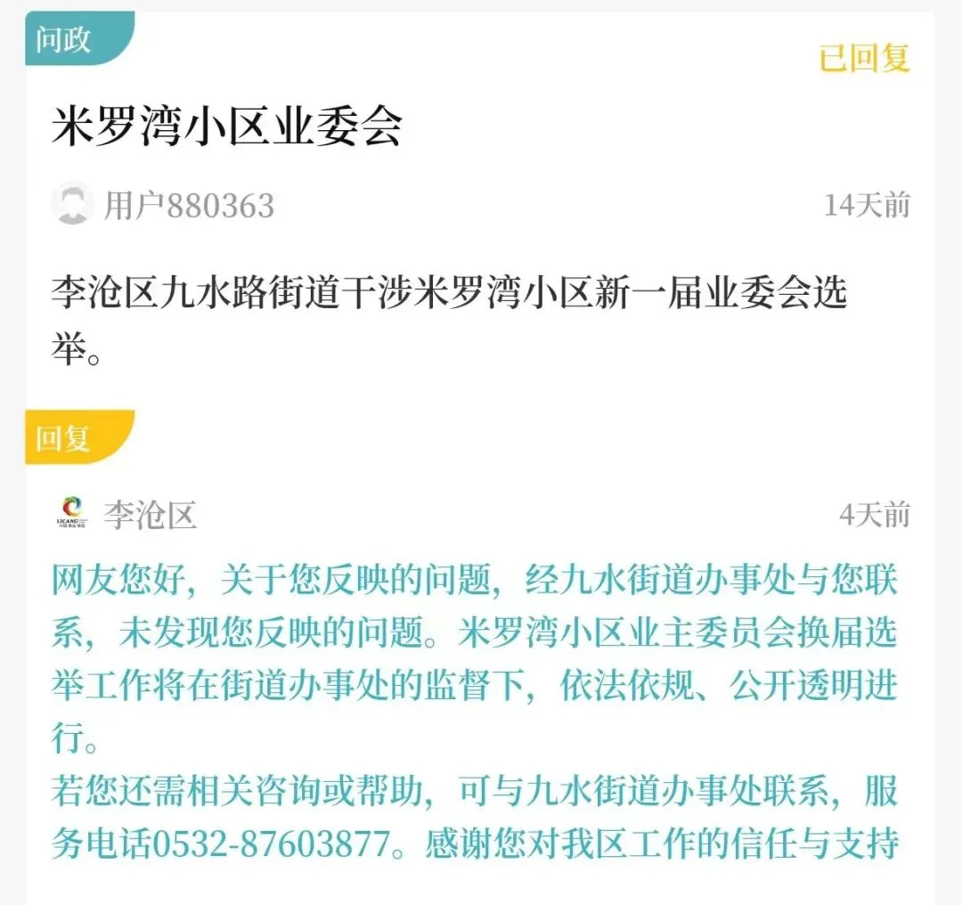 近日,有市民通过问政平台反映:李沧区九水路街道干涉米罗湾小区新一届业委会选举。李沧区答复如下: