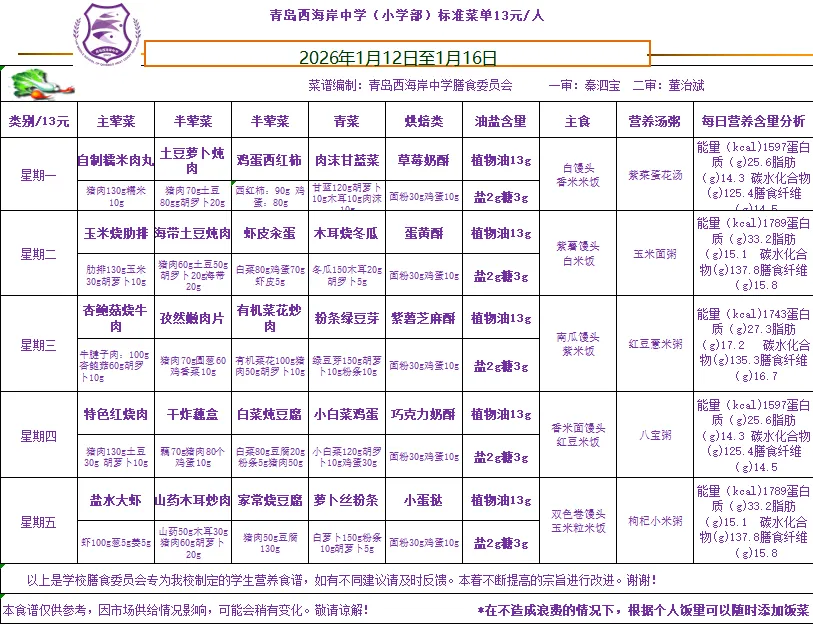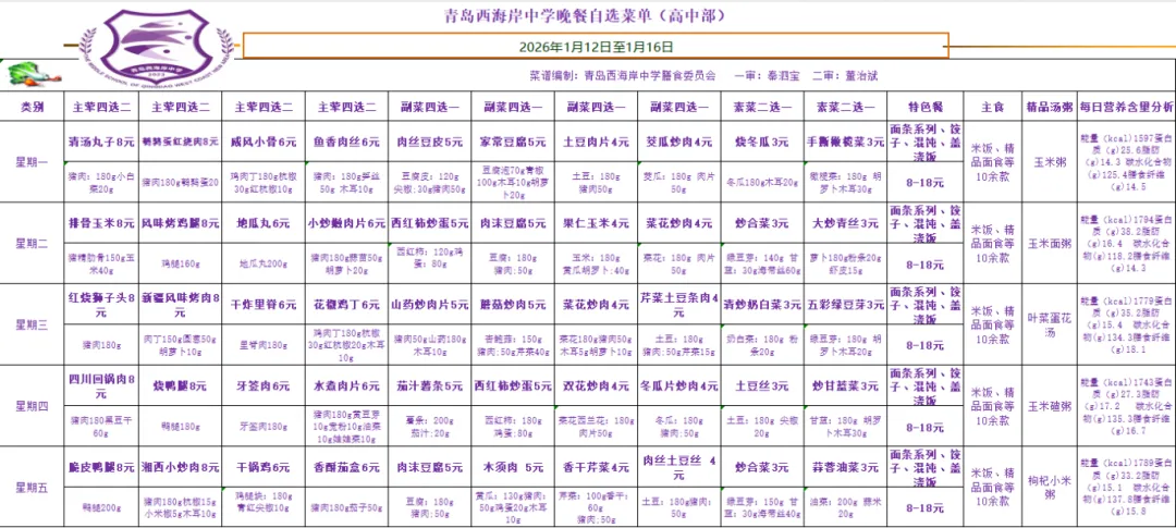 【西中·食谱】一周好“食”光——青岛西海岸中学2025-2026学年度第一学期第20周营养食谱(1.12—1.16)