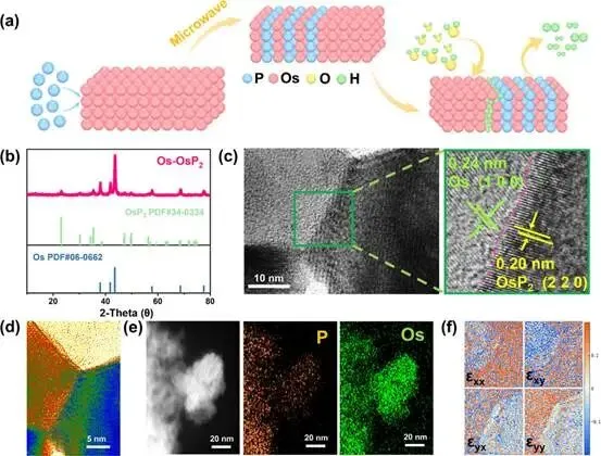 图1. a) Os-OsP2合成路径的示意图。b) Os-OsP2的X射线衍射图。c) Os-OsP2的高分辨率透射电镜图像。d) Os-OsP2的强度映射图。e) Os-OsP2各元素的能量色散X射线光谱。f)对应(100)和(220)晶面的晶格应变exx、exy、eyx和eyy。