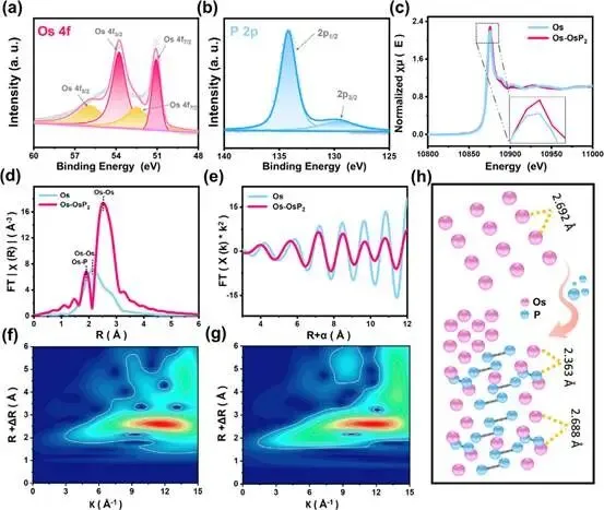 图2. Os-OsP2的XPS谱图 a) Os4f。b) P2p。c) Os L3边XANES以及d) Os箔和Os-OsP2相应的EXAFS谱图。e) Os-OsP2中的Os L3边EXAFS振荡。f) Os和g) Os-OsP2的EXAFS信号的WT。h) Os和Os-OsP2的模型示意图。