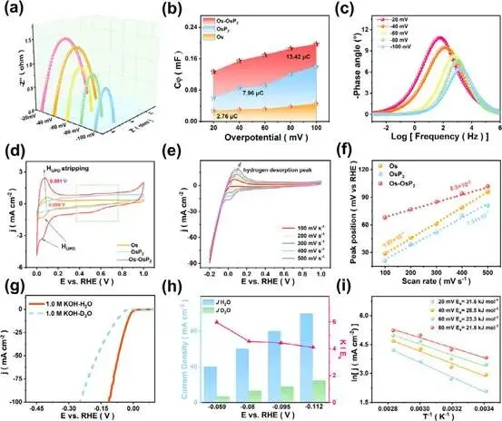 图3. 在1.0 mol/L KOH中 a) Os-OsP2催化剂在不同电位下的奈奎斯特图。b) HER过程中催化剂的Cφ随电位变化图。c) Os-OsP2的波特图。d)50 mV/s下的循环伏安曲线。e)氩气氛围中不同扫描速率下记录的循环伏安曲线。f)催化剂的氢脱附峰位置随扫描速率变化图。g) Os-OsP2催化剂在1 mol/L KOH-H2O和1 mol/L KOH-D2O溶液中的极化曲线。h)动力学同位素效应值随电位变化图。i) Os-OsP2的阿伦尼乌斯图。